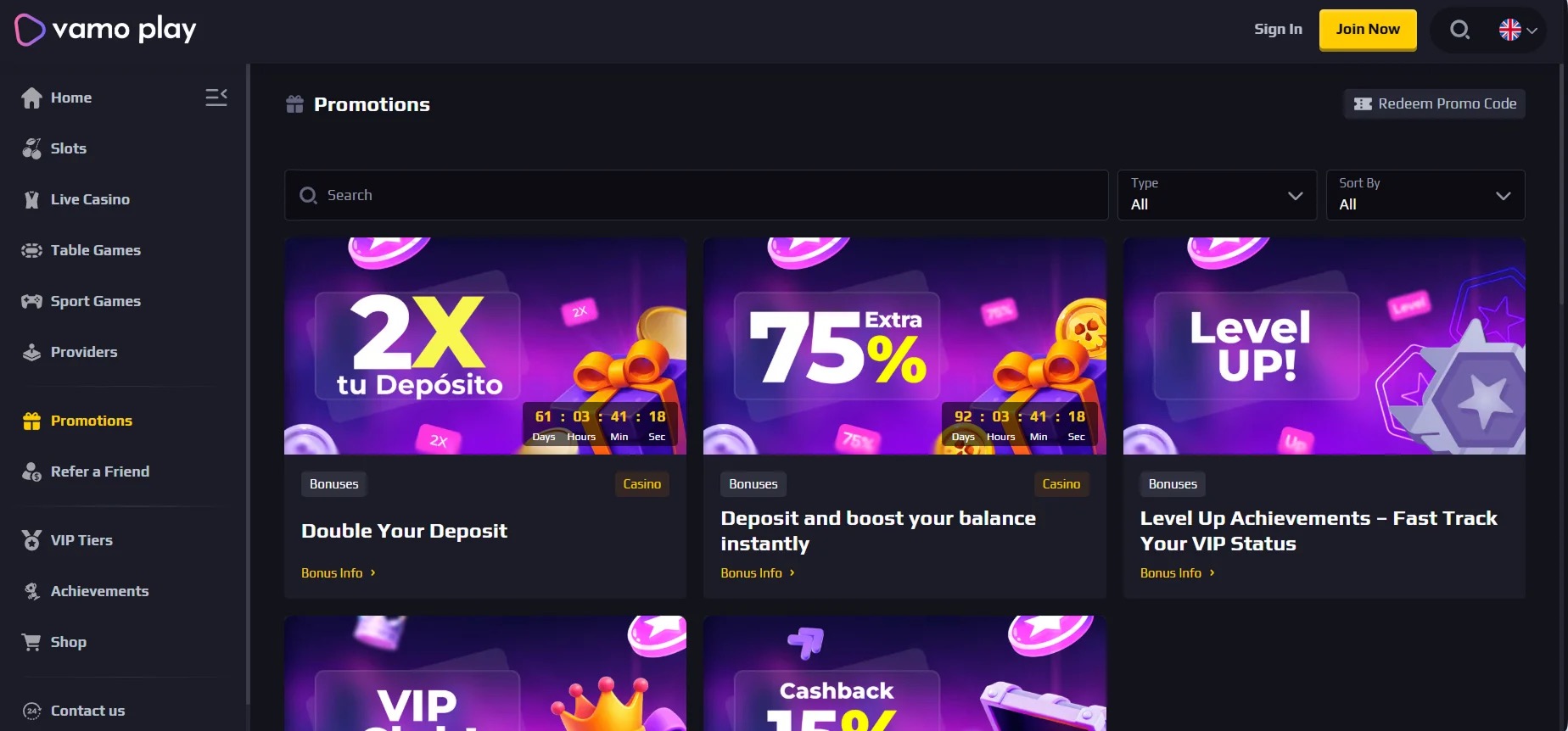 VamoPlay Casino offers a selection of promotions that cater to different player levels, though the overall count may not overwhelm those accustomed to larger programs elsewhere. New accounts can activate a deposit multiplier right away, while ongoing deals like cashback and referrals provide steady returns based on activity. The setup includes unique elements such as task-based achievements and a points shop, which add layers without complicating the basics.