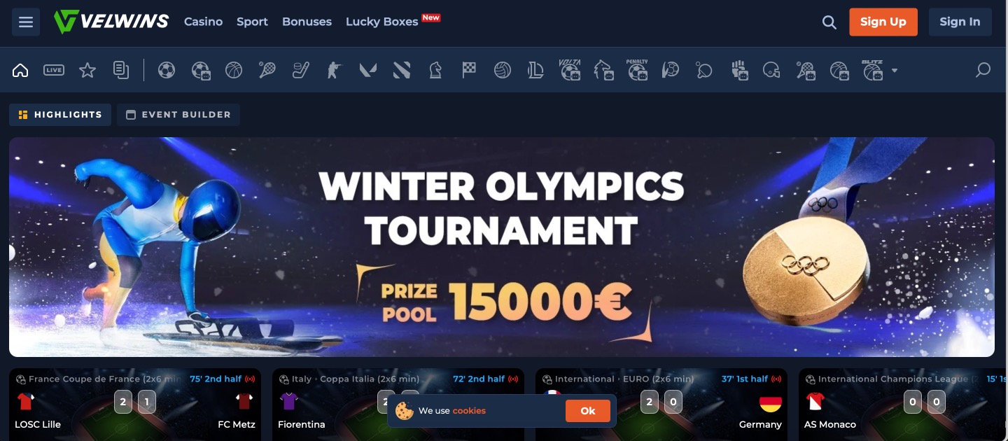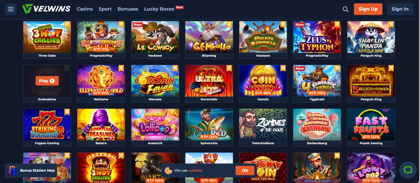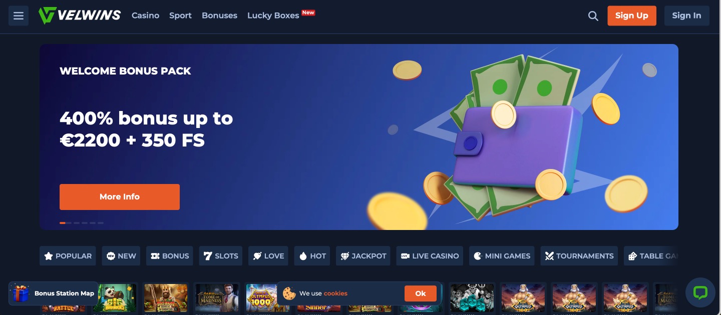 Velwins Casino operates as a combined casino and sportsbook platform with a large catalogue that exceeds 9,000 titles. Slots make up the bulk of the selection, joined by traditional table games and a complete live dealer area featuring real-time hosts. The site also covers sports betting markets across multiple disciplines. Clear sections and search functions help users move between casino games and betting options without difficulty.