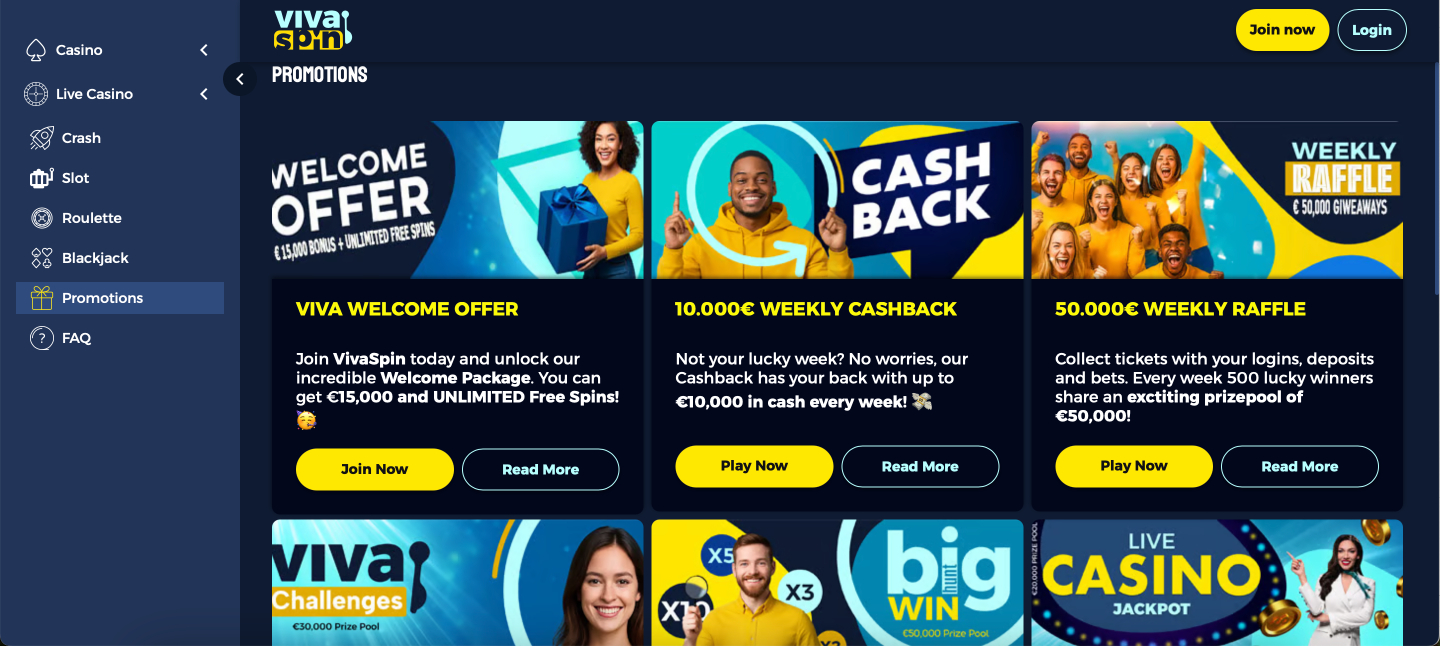 VivaSpin Casino structures its promotions around weekly events and a tiered welcome offer, providing options for both new and ongoing accounts. The initial package matches the first deposit up to €5,000 and awards 20 free spins for every €50 deposited in the first seven days, with no cap on the spins. Additional incentives include cashback up to €10,000 weekly, a raffle distributing €50,000 among 500 participants based on activity tickets, challenges offering €30,000 in bonuses for win multipliers, a big win hunt across selected slots for €50,000 prizes, and a live casino jackpot totaling €20,000 for consecutive wins in blackjack and roulette. These elements form a system that rewards consistent play, though eligibility and terms apply based on location and activity levels.