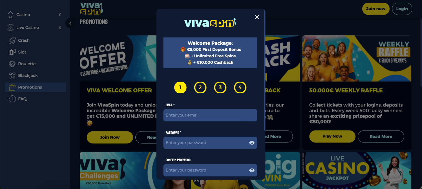 The welcome package at VivaSpin Casino includes a 100% match up to €5,000 on the first deposit, plus 20 free spins per €50 deposited in the first week with no upper limit. Weekly options cover cashback up to €10,000 on losses, a €50,000 raffle for active players, €30,000 in challenge bonuses, €50,000 for slot win hunts, and €20,000 live casino jackpots. Promotions trigger on qualifying activity, with terms outlining wagering and caps.