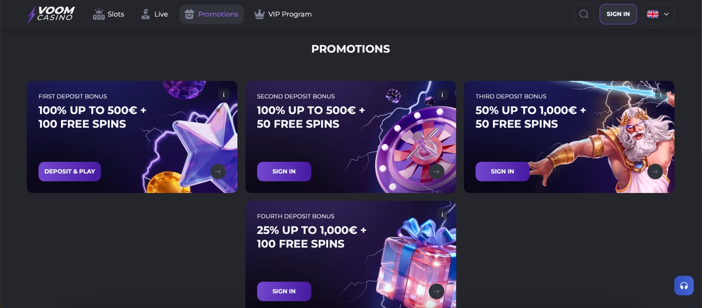 Voom Casino offers a four-stage welcome package totaling up to €3000 in match funds plus 300 free spins, applied across consecutive deposits starting at €20 each. The structure segments rewards with varying percentages and spin allocations, subject to 40x wagering on bonus and spin winnings within five days, alongside a €5 maximum bet rule. Conversion from bonus play caps at €5000 per individual offer. No prominent reloads or daily deals appear for existing users, with retention centered on a comp point accrual tied to slot bets.