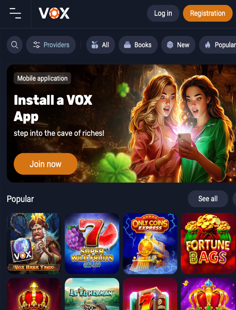 Vox Casino works with more than 60 studios including Pragmatic Play, BGaming, Spinomenal, NetEnt, Endorphina and many others. This variety brings both premium live streams and fresh slot releases. Games load fast and maintain quality on different devices. The lobby displays provider logos for easy browsing.