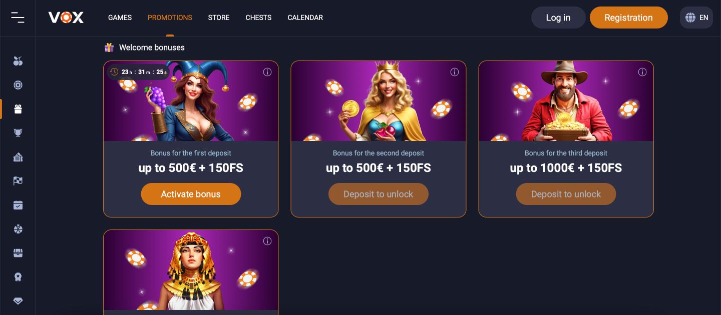 Vox Casino handles most promotions without requiring codes. Offers activate directly through the promo section or cashier during deposit. This removes the need to hunt for combinations or worry about expired strings. New players claim welcome stages seamlessly while recurring deals appear ready to select. Loyalty rewards and cashback credit automatically based on activity.