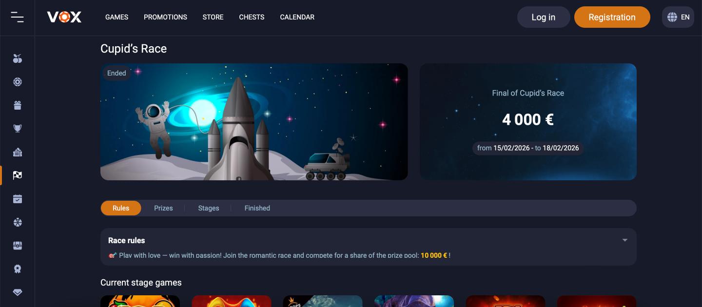 Vox Casino runs periodic slot races and leaderboard events with prize pools that refresh weekly or monthly. Points accumulate from qualifying bets on featured titles. Winners receive cash or bonus funds credited directly to accounts. Tournament section highlights current and upcoming races along with progress trackers. This format adds competitive edge for players who prefer leaderboards over standard sessions.