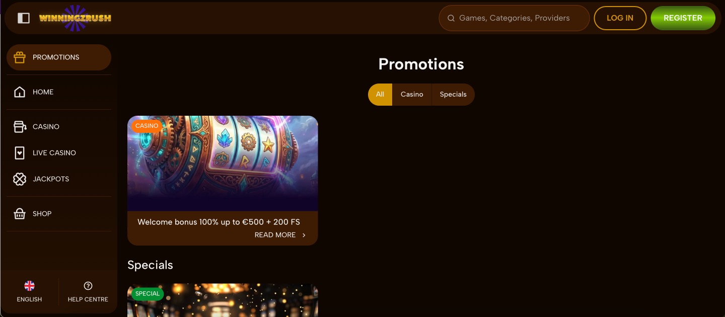 WinningzRush Casino offers a direct welcome bonus matching the first deposit at 100% up to €500, adding 200 free spins on popular slots. The package credits automatically once the minimum deposit clears. Wagering applies at 30x on the bonus amount. Further promotions include lotteries and occasional boosts listed in the dedicated section for active members.