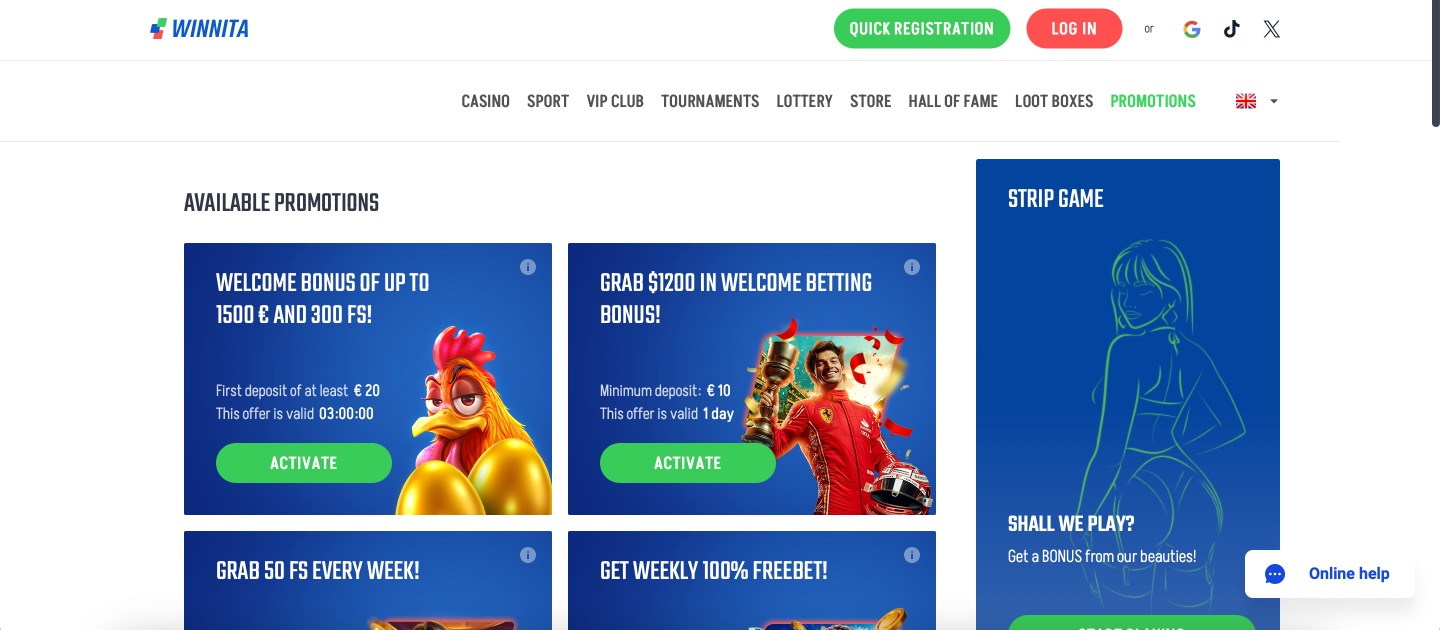 Winnita skips bonus codes completely. Promotions activate directly inside the promo page or cashier with a single selection before deposit. This removes code hunting issues and expired strings. Both casino matches and sports free bets appear marked clearly so users pick their preferred type without extra effort. New players gain the most from instant activation on the welcome steps.