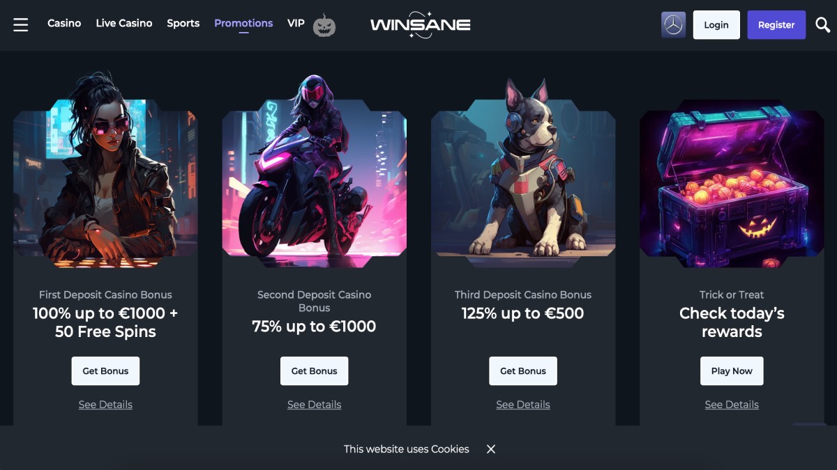 Winsane Casino welcomes new and existing players with a rewarding selection of bonuses designed to enhance both the first-time and ongoing gaming experience. New members are greeted with a generous three-tier welcome package that includes a 100% match up to €1,000 plus 50 free spins on the first deposit, a 75% bonus up to €1,000 on the second, and a 125% bonus up to €500 on the third deposit. Regular players can also enjoy continuous rewards through the Weekly Casino Reload, offering 50% up to €500 and 50 free spins, and 50 free spins on the Game of the Week, which keeps gameplay exciting and fresh. Additionally, the Monday Money Boost doubles deposits up to €100, while the Live Casino Cashback returns 20% of losses up to €200, adding a layer of security for live gaming enthusiasts. Competitive players can also participate in ongoing casino tournaments, providing extra opportunities to win prizes and elevate the thrill of play.