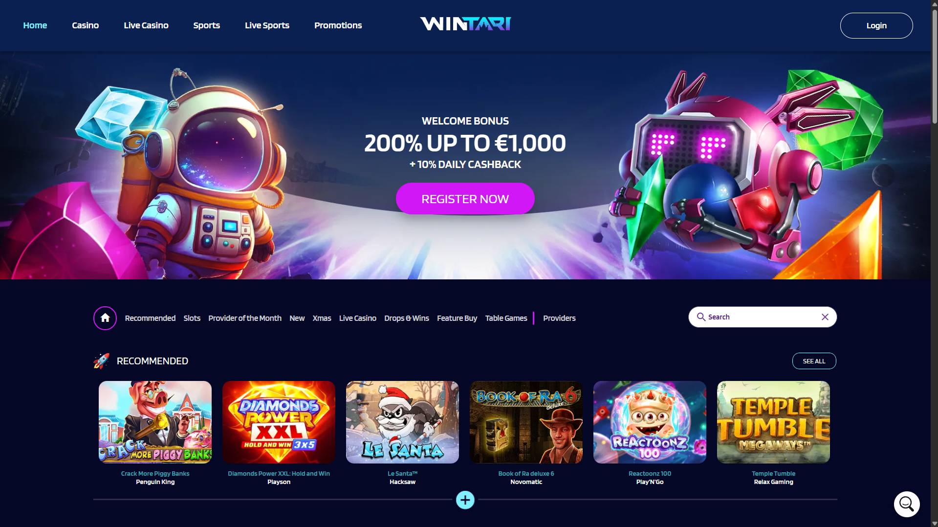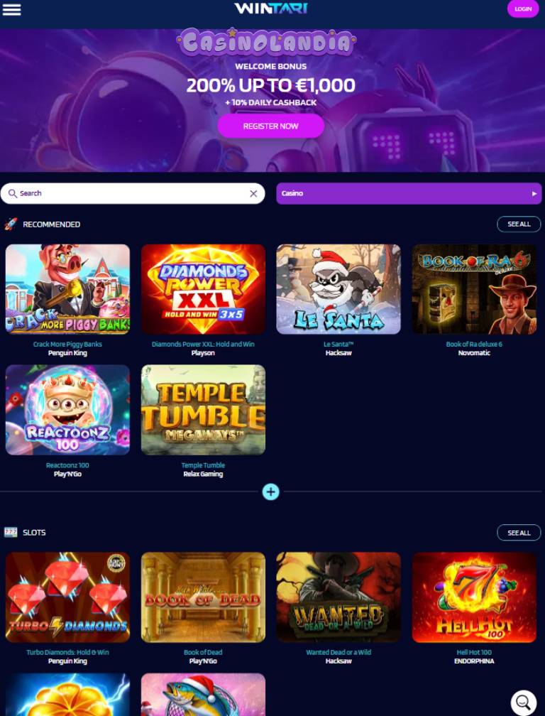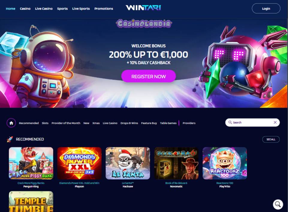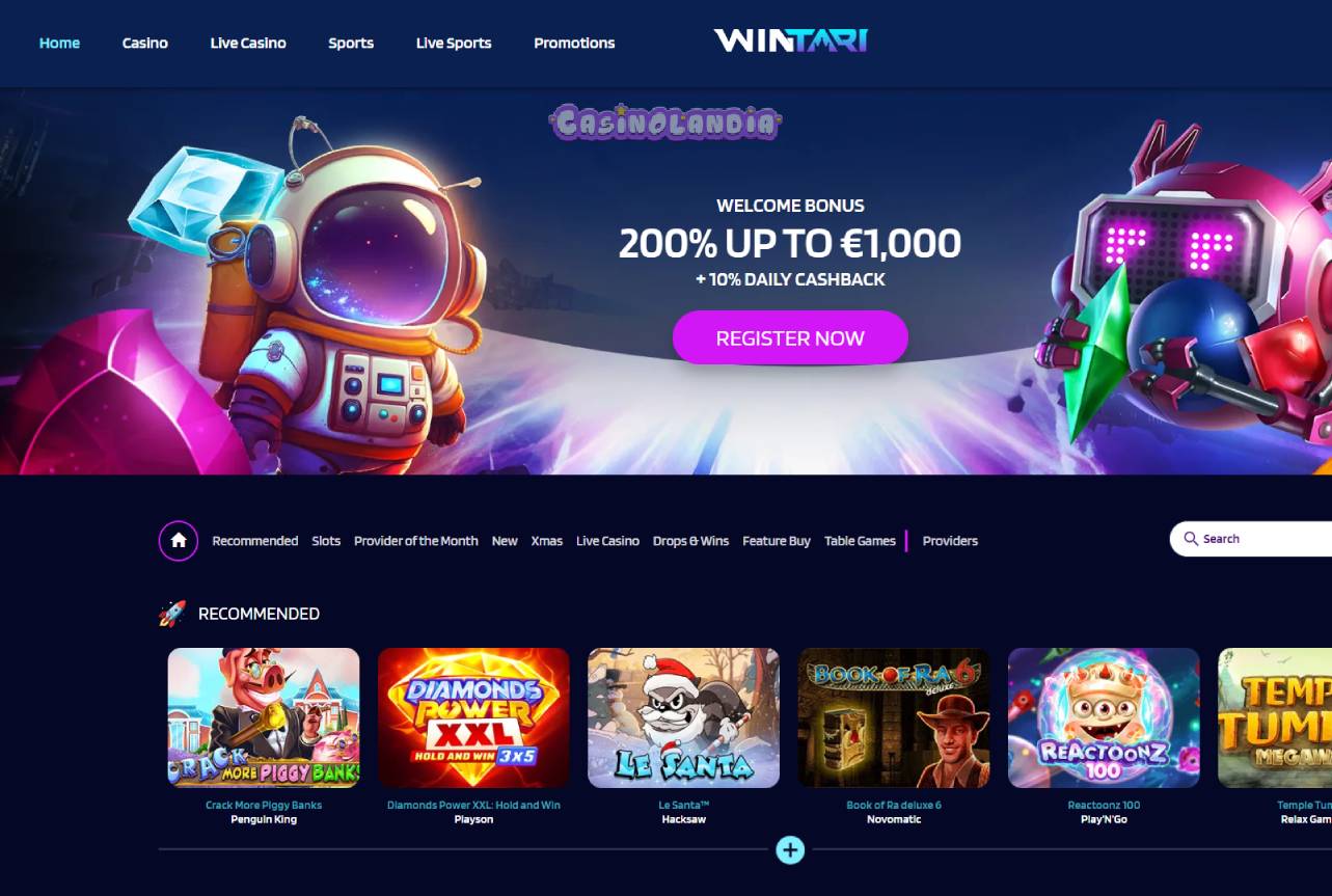 Wintari enters the market with a modern structure and a clear focus on variety. The platform blends slots, live dealer tables, and a full sportsbook under one roof, wrapped in a space themed interface built for quick navigation. First impressions point toward balance rather than excess, with clearly labeled sections, visible promotions, and smooth transitions between casino and sports areas. The welcome offer sets the tone, supported by ongoing cashback mechanics and rotating promo campaigns. Limits, currencies, and language options stay straightforward, which keeps the overall setup easy to understand. As a new brand, Wintari positions it...self around accessibility, structured rewards, and a platform designed for regular play rather than short term gimmicks.