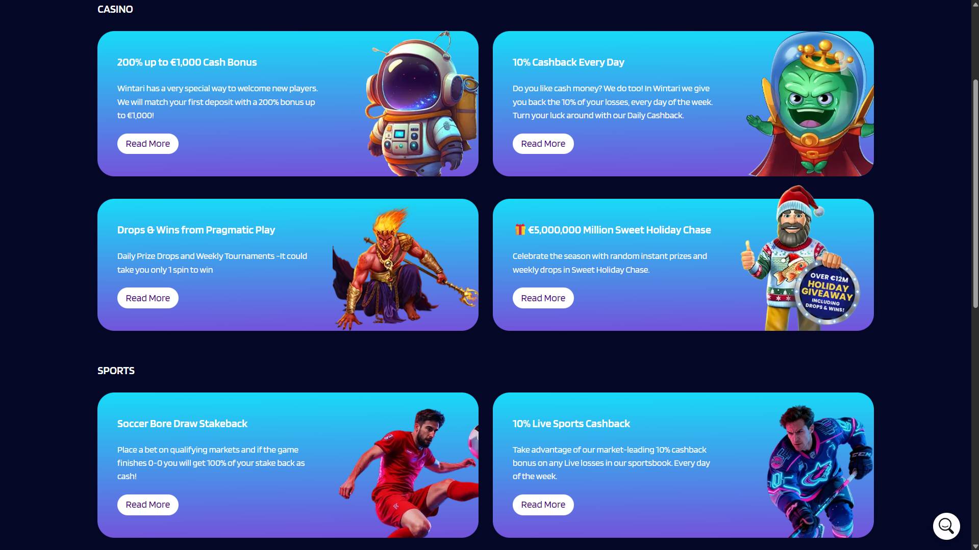 Promotions at Wintari are structured to support both new registrations and ongoing activity. Instead of relying on a single headline offer, the casino combines a strong entry bonus with daily cashback and rotating campaigns tied to slots and sports betting. This setup keeps rewards active beyond the first deposit and adds recurring value for regular play.