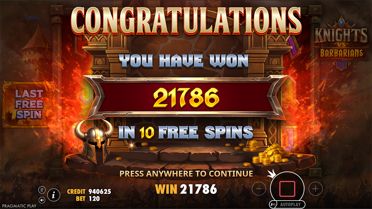 The Free Spins round in Knights vs Barbarians is triggered by landing three, four, or five Scatter symbols anywhere on the reels, awarding 10, 15, or 20 free spins respectively. Once activated, the feature significantly enhances gameplay by locking the center position into special symbol-only behavior, ensuring that every spin benefits from faction-based conversions, battles, or extra spin triggers. Free Spins Scatters can also award additional spins ranging from 2 to 10, allowing the bonus round to extend far beyond its initial length. This structure makes Free Spins the primary source of large wins and the most consistent path toward the slot’s maximum payout potential.