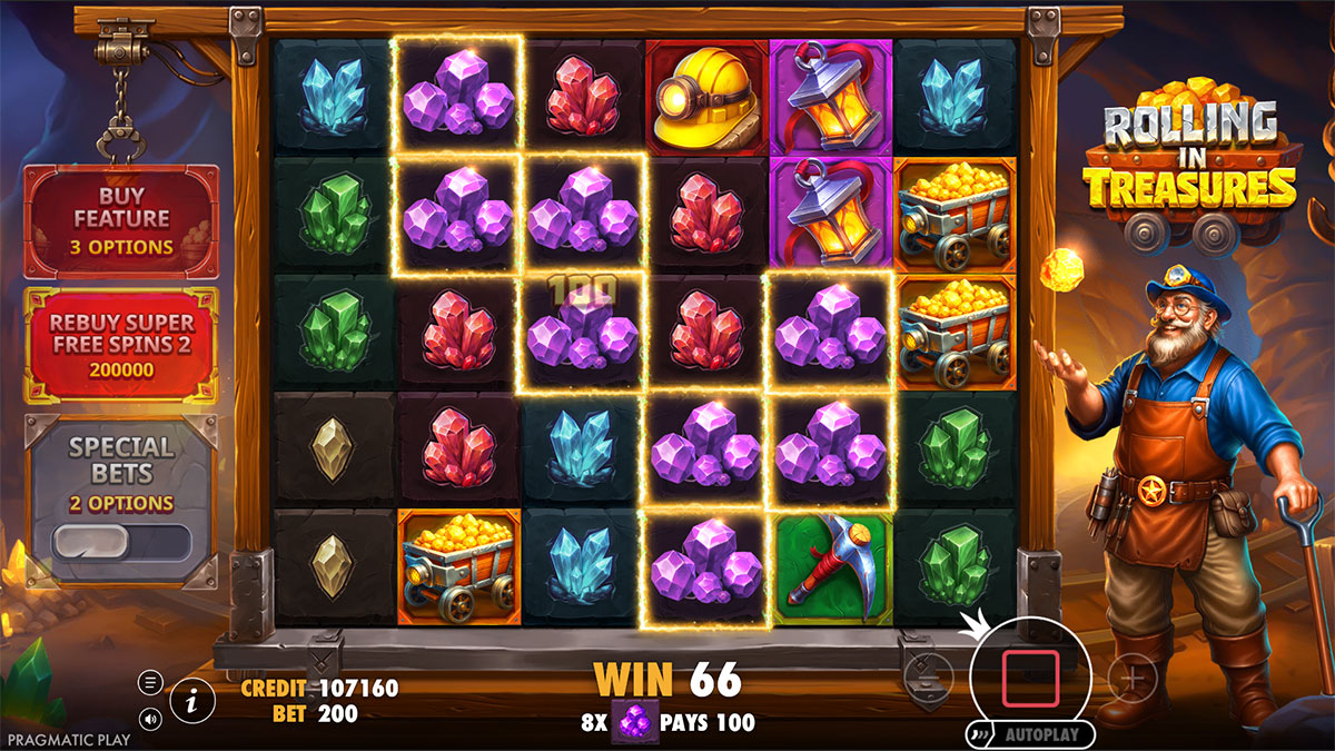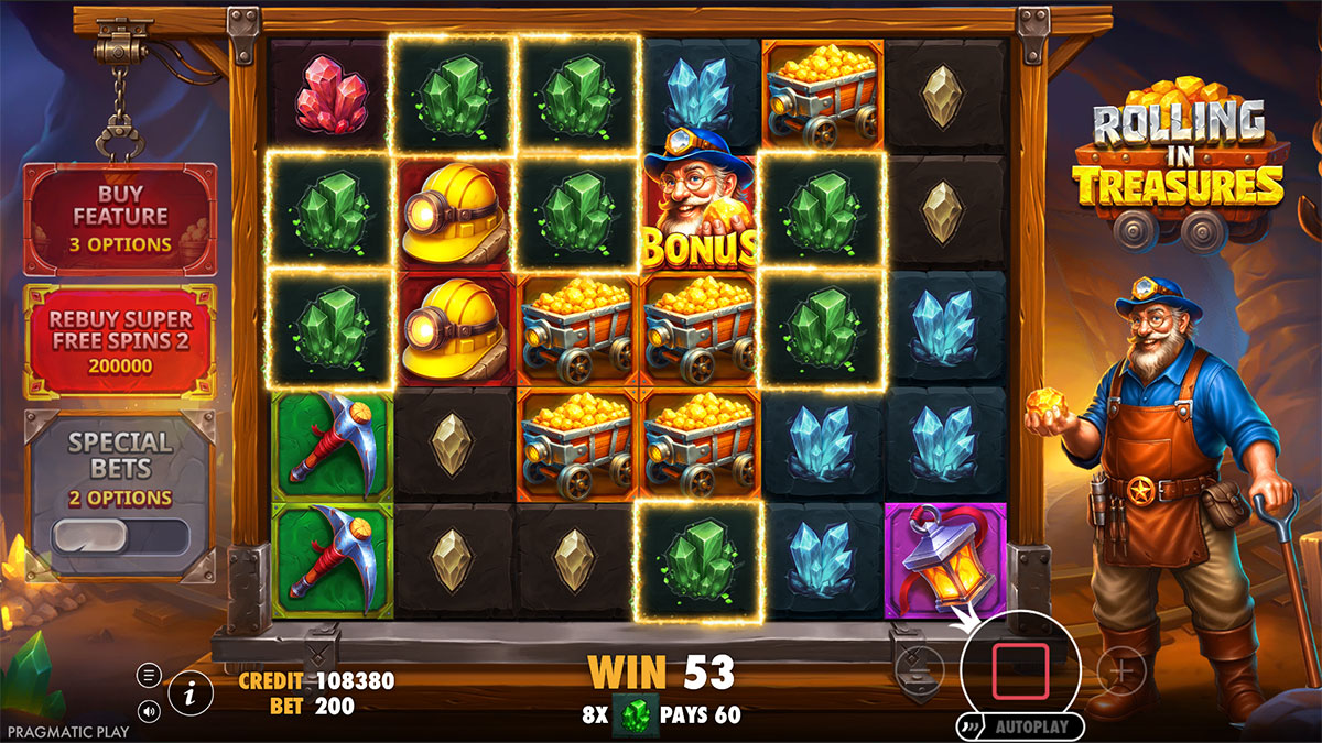 Rolling in Treasures ThumbnailRolling in Treasures transports players deep underground into a lantern-lit mine where gold nuggets shimmer between rough stone walls and opportunity waits on every spin. Built around a 6×5 grid and powered by cascading action, this release blends a familiar scatter-pay structure with a steadily increasing multiplier concept that can dramatically enhance consecutive wins. The atmosphere leans into classic prospecting imagery, featuring a cheerful miner and gemstone-studded reels that reinforce the pursuit of riches. With a maximum win potential of 5,000x the stake and a high-volatility profile, the slot is clearly designed for players who enjoy suspenseful gameplay with the possibility of substantial payouts. Its combination of tumbling reels, overlay multipliers, and bonus enhancements aims to keep each spin engaging from start to finish.