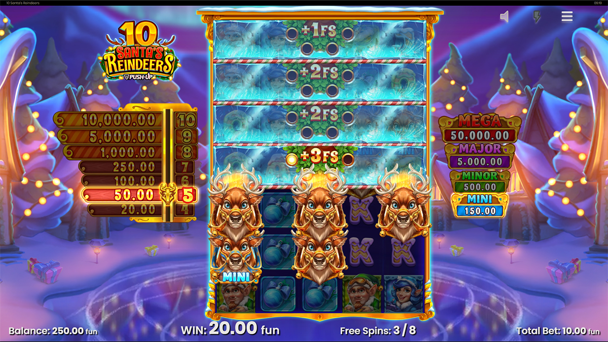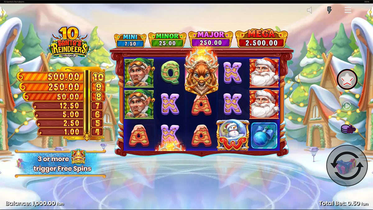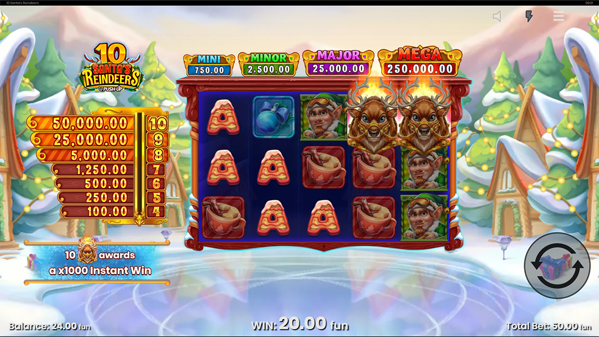 The features in 10 Santa’s Reindeers combine instant cash prizes, jackpot reindeer, and an expandable free-spin grid to create multi-layered gameplay filled with dynamic progression. Each feature interacts with the others to maintain consistent excitement, offering bursts of value through reindeer drops and longer-form anticipation during the unlocking of rows in free spins. Together, these systems ensure that every spin has meaningful potential and that feature-driven mechanics shape both the pace and rewards of gameplay.