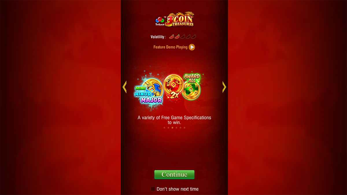 Mechanically, 3 Coin Treasures is built around the interaction of its three signature coin symbols and the TriLuck system. When Dragon, Koi, or Tiger coins appear, they can trigger different free gameplay modes, and landing multiple coins at once allows their effects to stack or activate simultaneously. This layered mechanic introduces strategic excitement without adding complexity to the base game. The Lock & Respin system used during bonus rounds freezes winning symbols in place while granting a limited number of respins, creating escalating tension as the grid fills. Combined with fixed jackpot rewards and multipliers, the mechanics ensure that bonus rounds feel meaningfully different from standard spins while remaining intuitive.