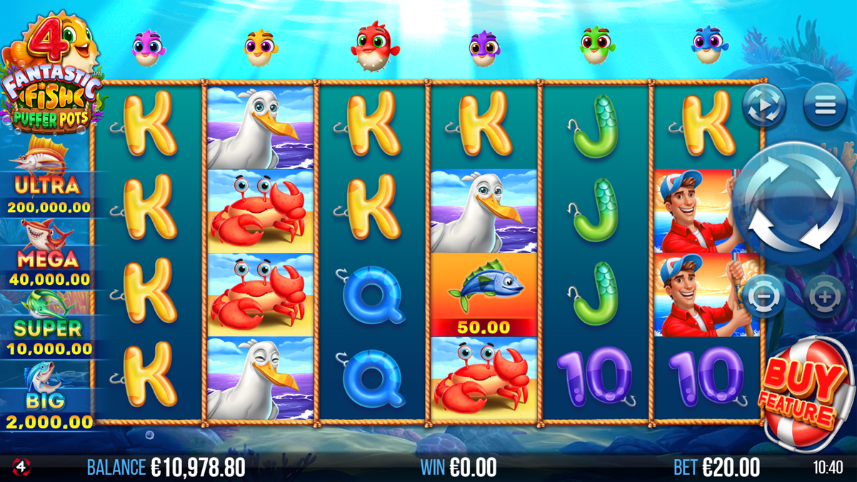 This slot is a powerhouse of features, headlined by the “Puffer Pots” which act as collectors and multipliers for the various fish symbols that land on the reels. The core mechanics include the “Cash Collector” system, where fish symbols land with direct monetary values, and the “Respins” bonus round which offers a sticky-symbol “Hold and Win” experience. Additionally, the game features four fixed jackpots (Mini, Minor, Major, Grand) that can be triggered through the Puffer Pots. Random modifiers like the Shark, which eats fish to combine their values, and the Octopus, which can change symbols or add multipliers, add a layer of unpredictability to the base game. There is also a “Buy Feature” for players who wish to enter the bonus rounds instantly.