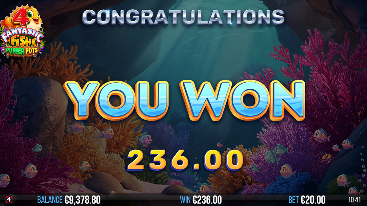 Yes, the game offers a highly specialized bonus round that functions primarily as a Respin feature, which serves as the “Free Spins” equivalent in many modern 4ThePlayer titles. When the bonus symbols trigger this mode, the standard reels are cleared to make room for Fish and Puffer Pot symbols. You start with a set number of respins, and every time a new cash symbol or modifier lands and locks into place, the respin counter resets to its original value. This “Hold and Win” style mechanic continues until the entire grid is filled or the respins run out. It is during this round that the Puffer Pots can reach their maximum potential, collecting values and exploding into huge prizes, while the Shark can appear to eat fish and combine their values into a single, massive multiplier.