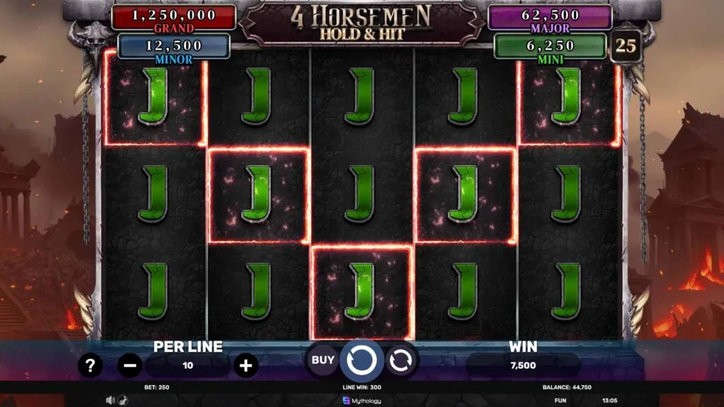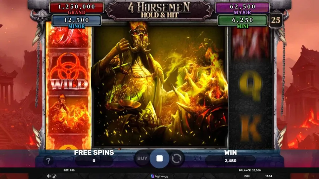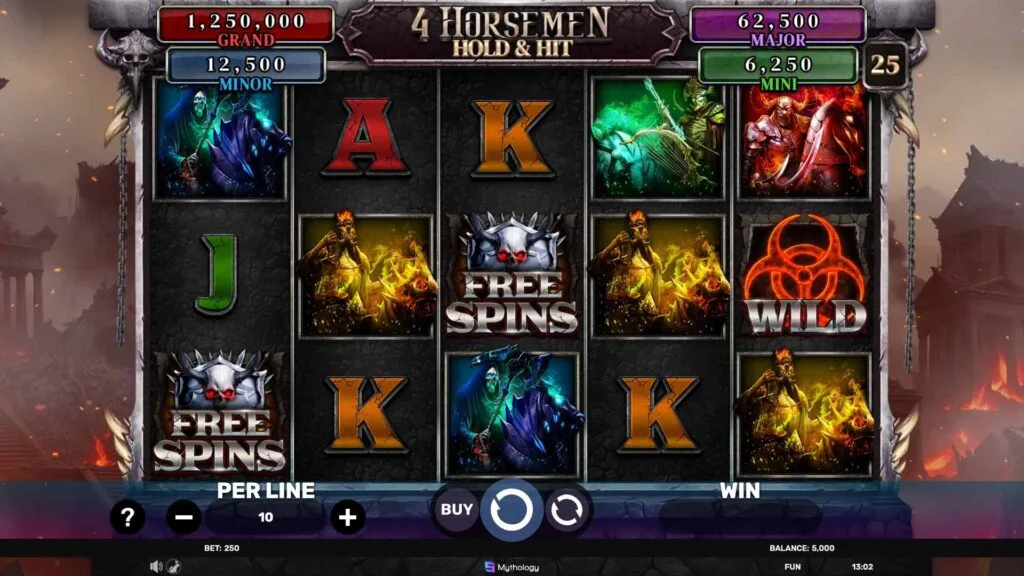 The symbols in 4 Horsemen tie directly into its ominous theme, with lower-tier icons drawn from standard card ranks and higher-value ones reflecting the horsemen’s mystique. Wild symbols serve a critical role, stepping in for others to complete winning lines, while Scatters unlock the Free Spins feature when enough appear. Mega Symbols can span multiple reel positions, boosting the odds of a sizable win, and Stacked Wilds may cover entire reels, enhancing payout potential further. Grasping how these symbols function is essential for navigating the game effectively, as their interactions with features like Hold & Hit can shift the session’s outcome significantly, adding depth to each spin.