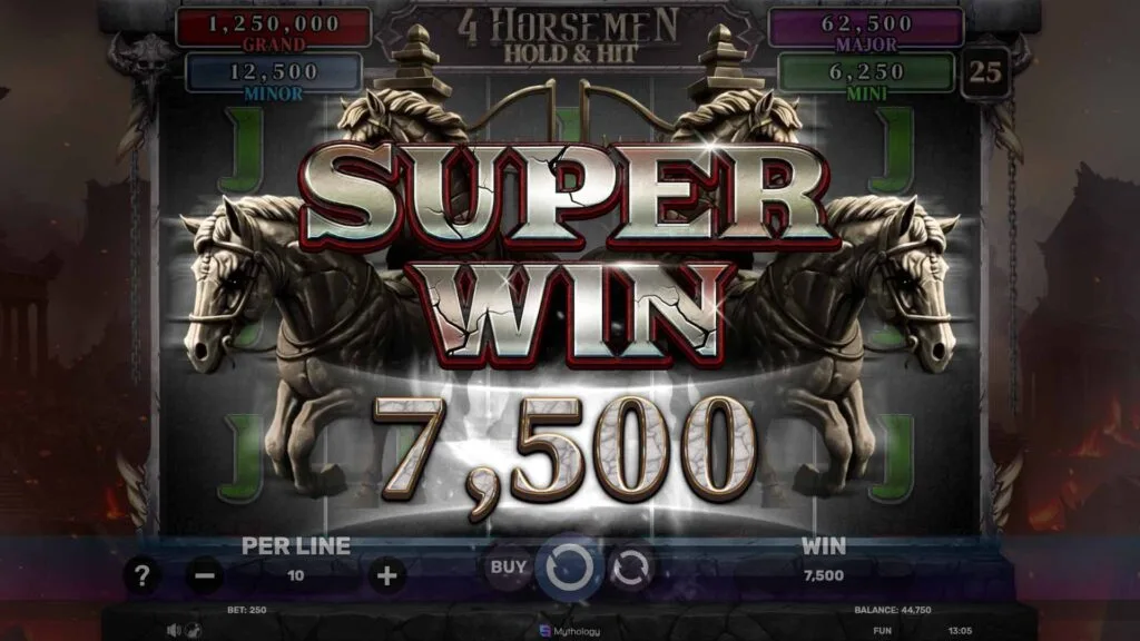 Accommodating various budgets, 4 Horsemen provides a betting range stretching between $0.30 and $300 per spin. Players favoring modest stakes can opt for the lower end at $0.30, allowing prolonged sessions without heavy investment—ideal for those testing the game’s mechanics or pacing themselves. Conversely, the upper limit of $300 appeals to those chasing larger returns, where a single spin could yield the x1500 maximum win, translating to a hefty payout. This flexibility ensures the slot aligns with different playing styles, from cautious approaches to bold, high-stake moves, all while maintaining the game’s intense atmosphere across the spectrum.
