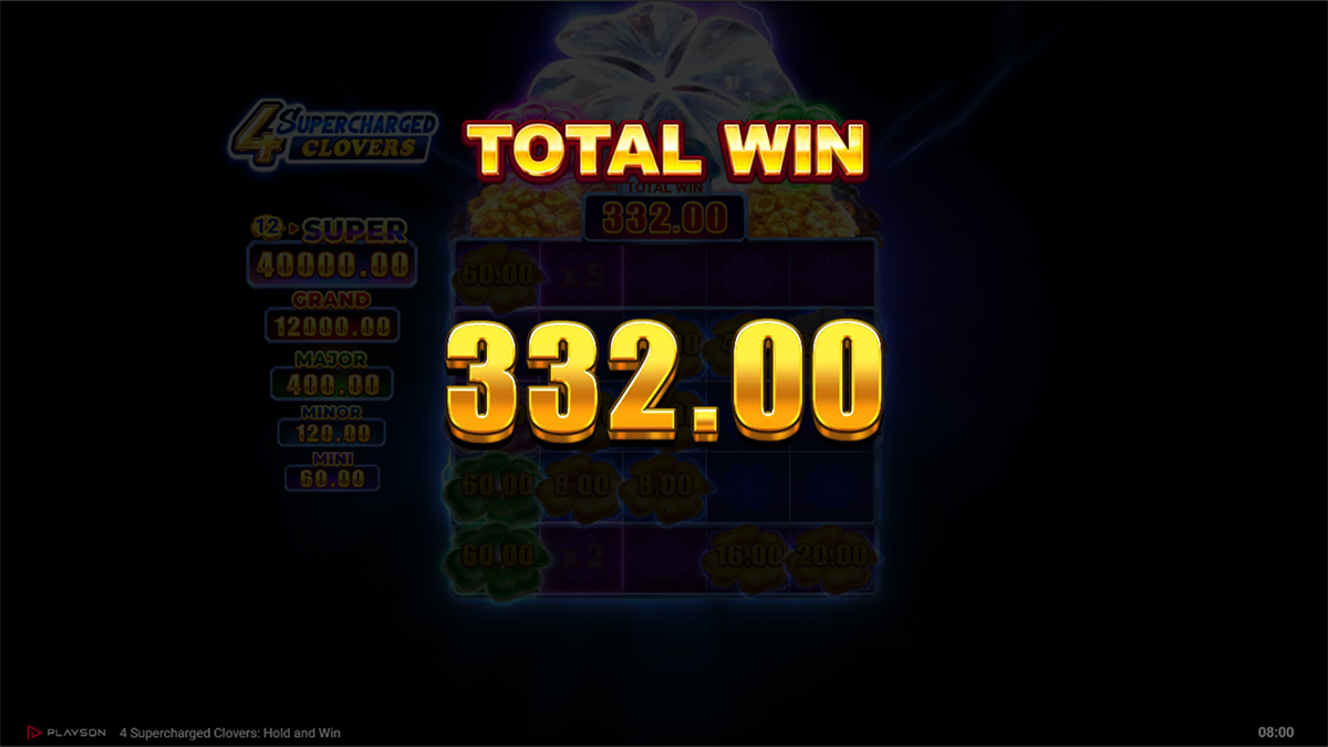 The RTP of 4 Supercharged Clovers: Hold and Win has not been officially disclosed by Playson at this time. This means players cannot see an exact long-term return percentage before playing. In practice, the RTP may vary depending on the casino and configuration used.