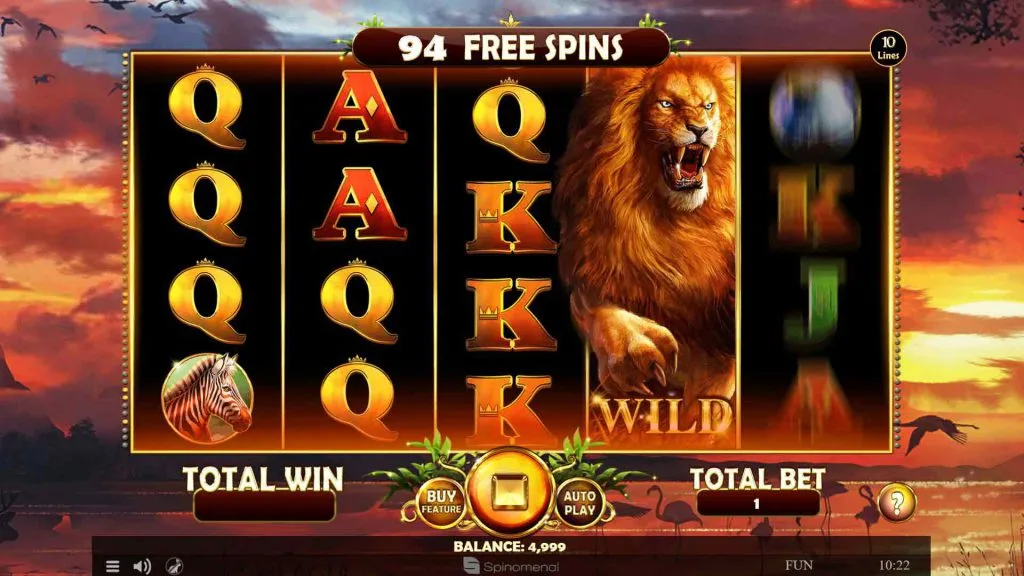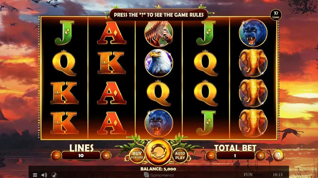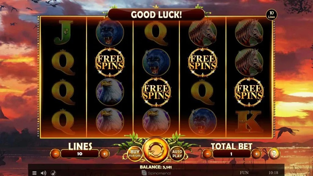 The symbols in African Fortune echo the untamed essence of the savanna. Top-tier icons feature the Elephant, paying up to 100 for five matches, followed by the Leopard, Eagle, and Zebra with tiered rewards. Lower-tier symbols include stylized card ranks: A, K, Q, and J. The Wild, depicted as a commanding lion, substitutes for all except the Scatter, boosting win possibilities. The Scatter activates Free Spins mode, heightening the game’s appeal.