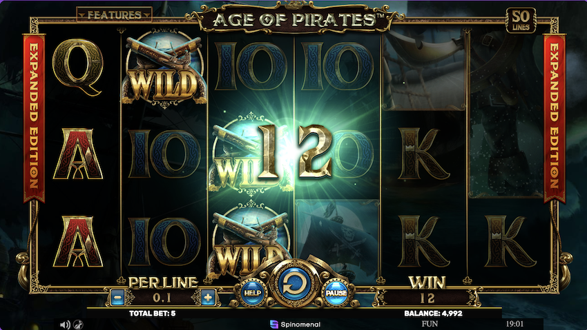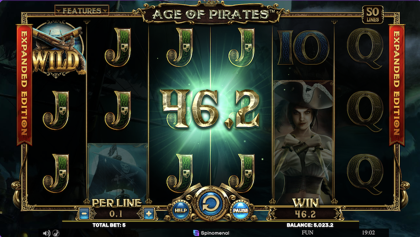 The paytable in Age of Pirates Expanded Edition ties into its pirate theme with distinct symbols. High-value icons, like the captain or treasure chest, offer top payouts, with the highest symbol delivering x4 for six on a payline. Mid-tier symbols, such as ships or cannons, provide solid returns, especially with special features.