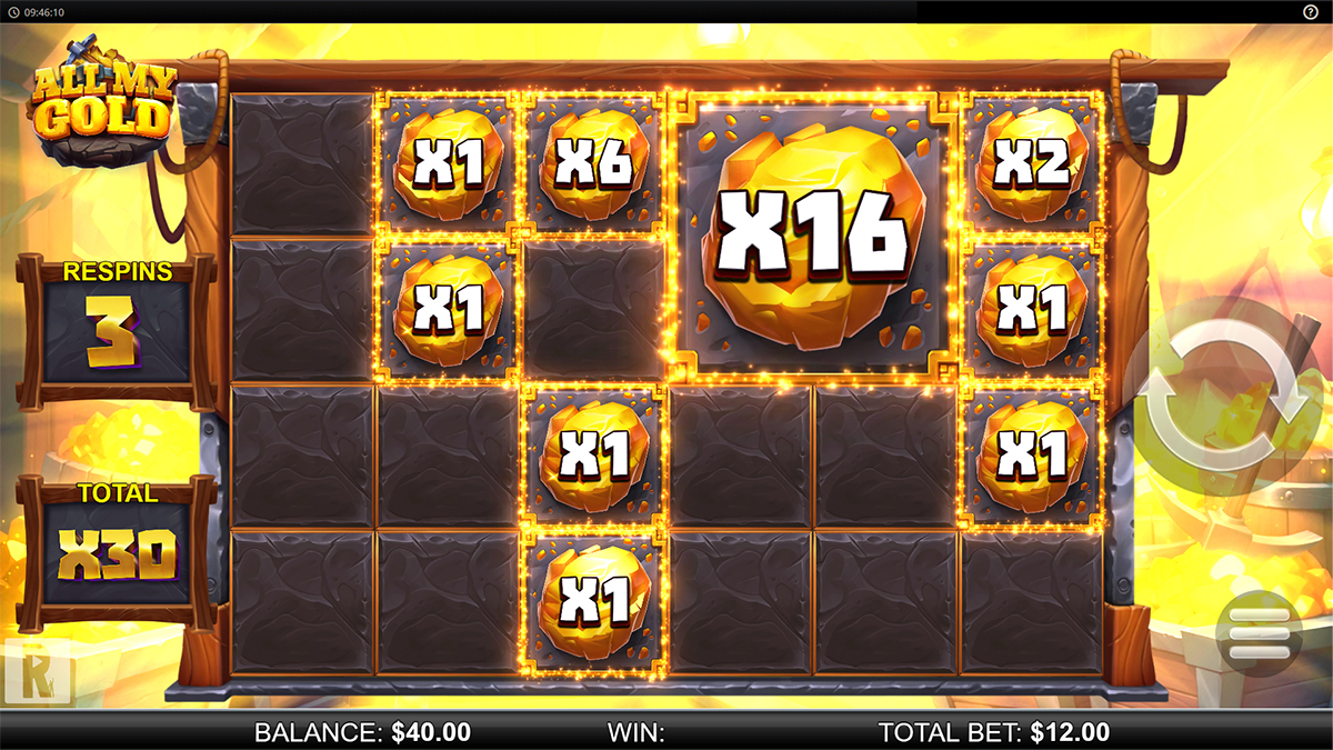 All My Gold does not include a classic free spins feature in its design. Instead, the game replaces traditional free spins with a Bonus Respins round that serves as the main bonus mechanic. This feature delivers win potential through held symbols, respins, and powerful multipliers rather than free spins.