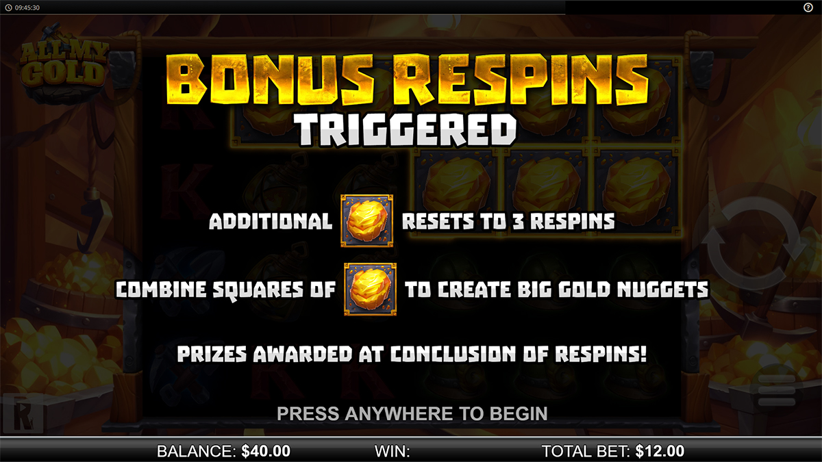 GOLD NUGGET Symbol: Triggers the Bonus Respins feature and carries random multipliers.