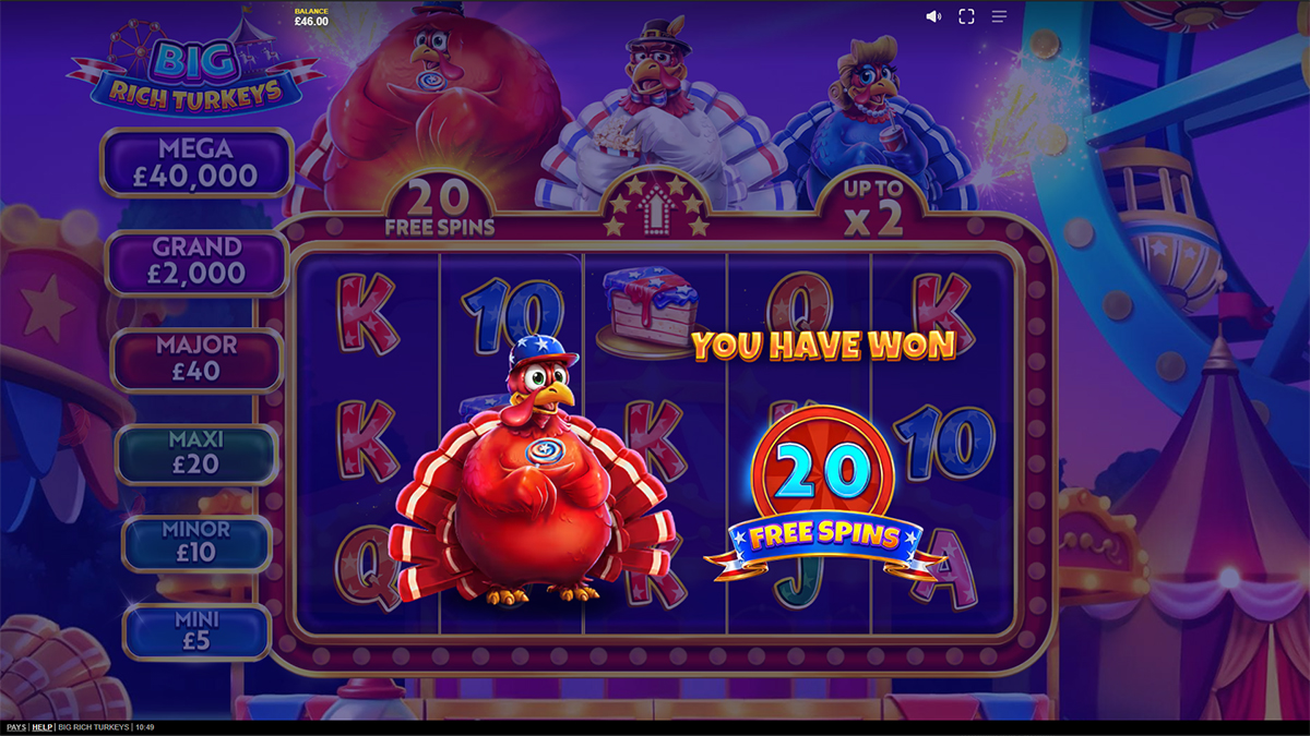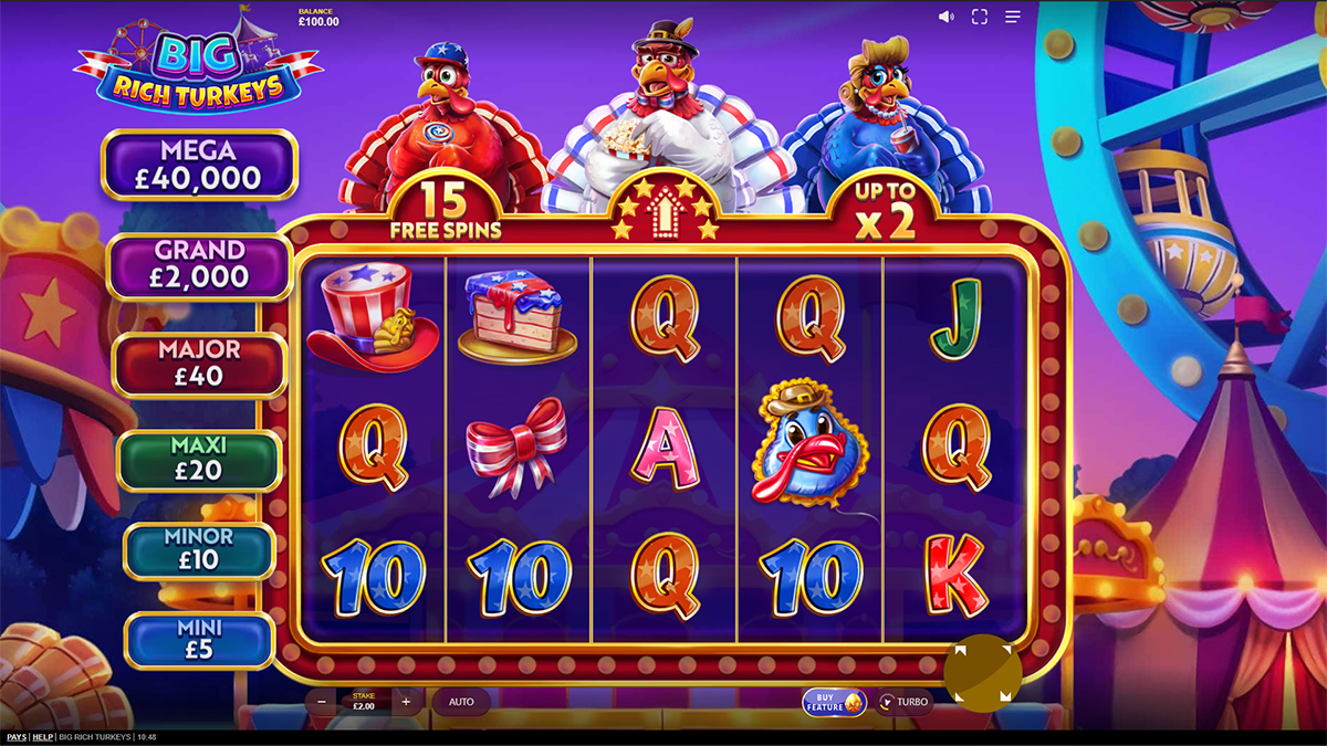 As a high-volatility slot, Big Rich Turkeys caters to thrill-seekers who appreciate bigger risks for even greater rewards. Wins may not occur frequently, but when they do, they can be substantial—especially with a maximum payout of 20,000x the stake. The hit frequency of 19.65% supports this structure, ensuring a balance between dry spins and exciting bursts of activity. This volatility profile makes the game ideal for players who enjoy building anticipation, as major rewards are often tied to the activation of Free Spins, multipliers, and jackpots. Each spin carries the tension of unpredictability, embodying the spirit of amusement park excitement where anything can happen in an instant.