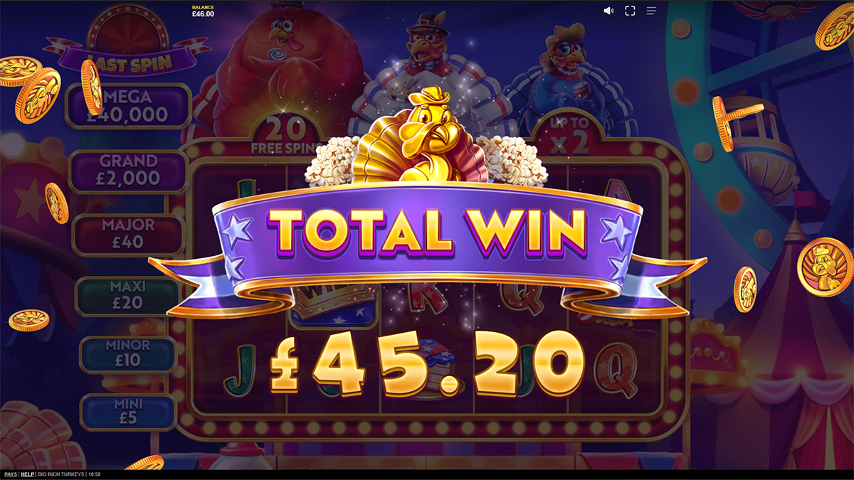 Big Rich Turkeys is a charming and lively slot from Red Tiger Gaming that successfully combines whimsical design with deeply rewarding gameplay. The amusement park theme sets a vibrant backdrop for a series of exciting features that keep every spin unpredictable and entertaining. With its high volatility and potential max win of 20,000x the stake, the game provides the perfect balance between risk and reward, appealing to players who enjoy big win potential wrapped in fun, lighthearted visuals. The Turkey Features—Red, White, and Blue—introduce a dynamic layer of progression that keeps the game fresh even after extended play. Each feature adds depth, from increasing spins and multipliers to raising jackpot values, making it easy for players to stay invested as the action unfolds. Combined with smooth mechanics, rich animation quality, and flexible betting options, Big Rich Turkeys proves to be both approachable for newcomers and deeply engaging for seasoned players. It’s a prime example of Red Tiger’s ability to merge humor and excitement in a single package, offering a thrilling journey that can easily become one of the standout slots of the year.