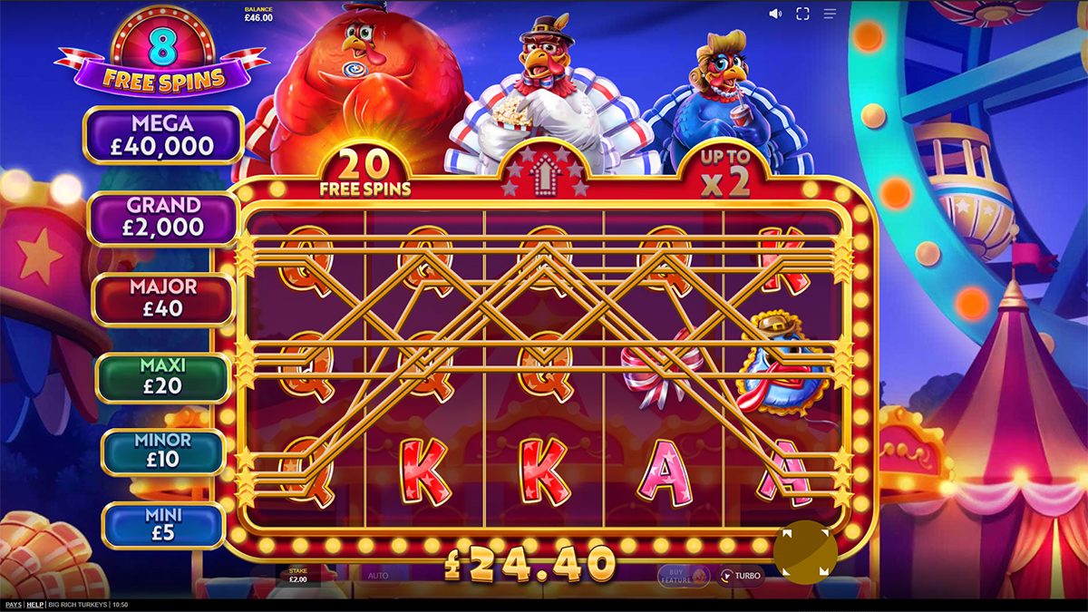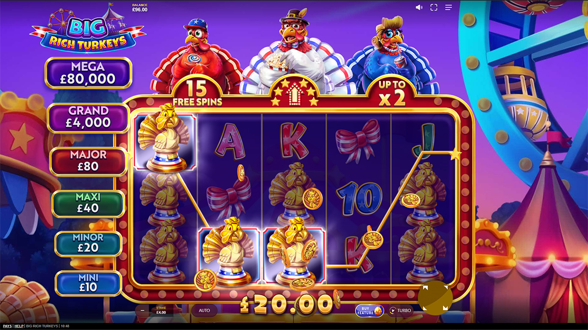 The gameplay of Big Rich Turkeys revolves around a 5×3 grid layout and 25 fixed paylines, offering a classic slot setup infused with a vibrant thematic twist. Players form winning combinations by landing three or more matching symbols from the leftmost reel across adjacent positions. The amusement park theme fills the screen with colorful, animated turkeys and an upbeat soundtrack that captures the energy of a festive fairground. The base game keeps the excitement alive through Mystery Symbols, Turkey Features, and Wild wins that can quickly transform a regular spin into a rewarding spectacle. Jackpots line the left side of the reels, teasing massive potential payouts, while the inclusion of a Feature Buy option gives players direct access to the slot’s most exhilarating moments without waiting for random triggers.