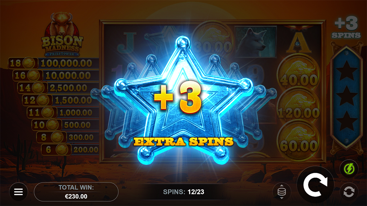 The betting range in Bison Madness PrizeTower™ spans from €0.10 to €100 per spin, catering to both cautious players and high-stakes enthusiasts. This flexible range ensures that everyone can enjoy the game regardless of their bankroll size. Whether you prefer smaller, safer bets or full-throttle spins, this slot accommodates all playstyles.
