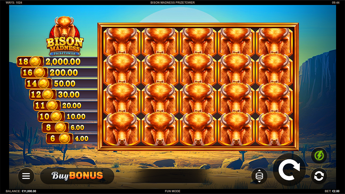 Bison Madness PrizeTower™ utilizes the 1024 Ways-to-Win mechanic instead of traditional paylines, providing players with a vast array of winning opportunities on every spin. Wins are achieved by landing matching symbols on adjacent reels from left to right, regardless of exact position. This setup increases excitement and enhances the slot’s dynamic, fast-paced feel.