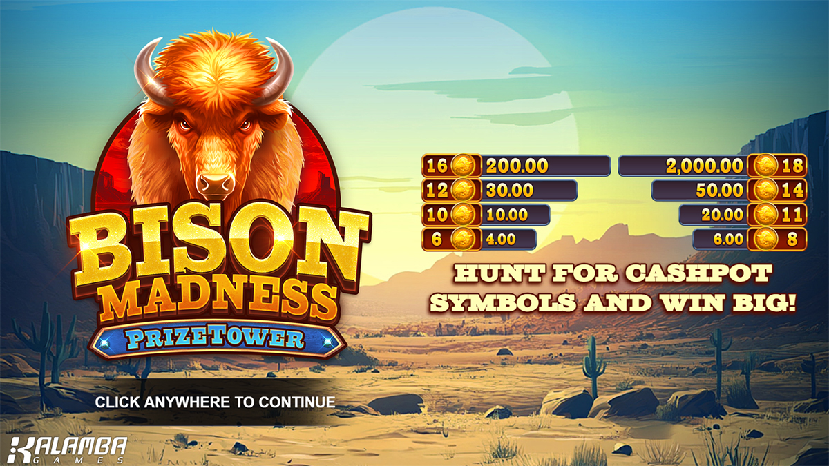 Bison Madness PrizeTower ThumbnailBison Madness PrizeTower™ by Kalamba Games is a thunderous 5×4 slot adventure that transports players deep into the wild prairies, where majestic bisons, fierce wolves, and dazzling stars collide in a thrilling spectacle of power and payout potential. With 1024 ways to win, this game stands as a monument to the untamed spirit of the American wilderness, blending nature’s raw energy with modern gaming innovation. Every spin immerses players in a vibrant world of animal symbols, booming sound effects, and heart-pounding mechanics like Cashpots and Multiplier Wilds. Designed for high-volatility thrill-seekers, this slot promises a rollercoaster of emotions as players chase the ultimate goal — climbing the epic PrizeTower for massive rewards that can reach up to 5120x their bet. It’s a perfect blend of intensity, innovation, and wild excitement, setting a new benchmark for nature-themed slot experiences.