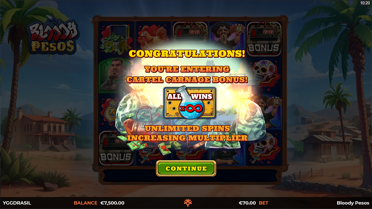 • Cartel Carnage: A Free Spins round with infinite spins and progressive multipliers.