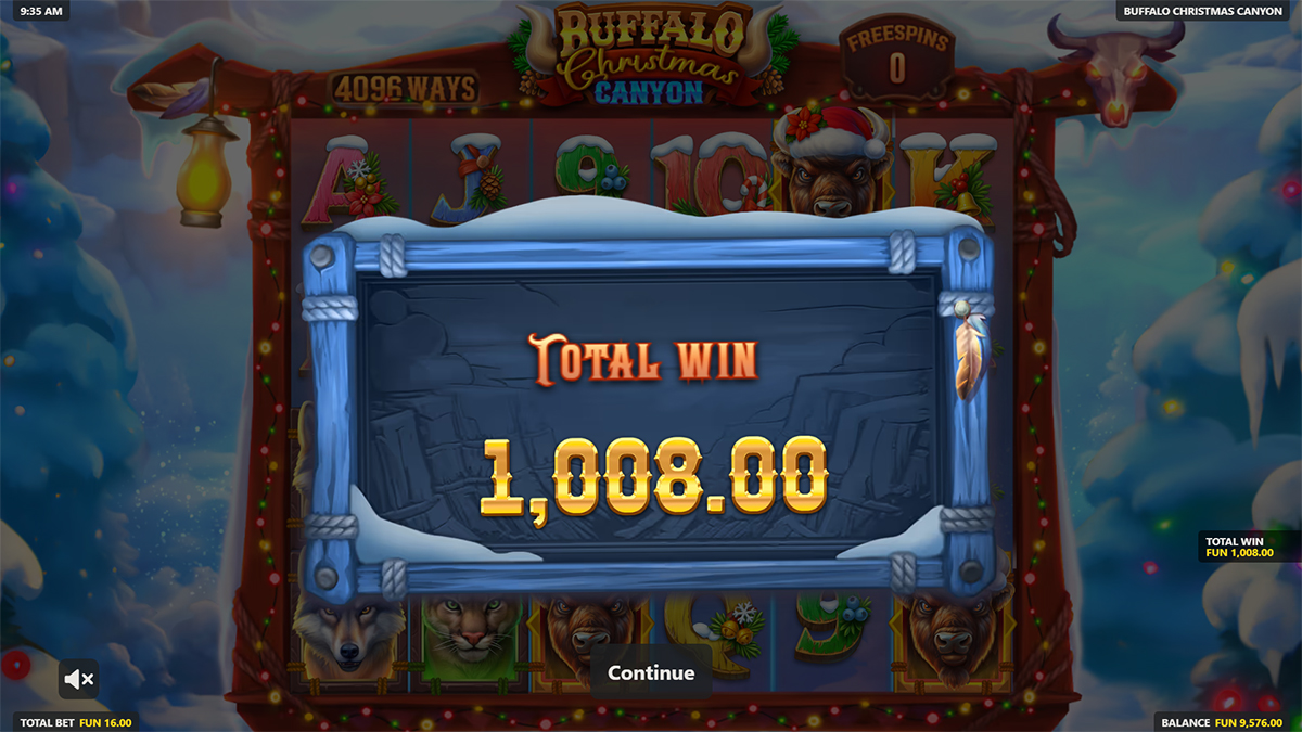 The maximum win in Buffalo Christmas Canyon is an impressive x14,217 of your total bet. This high win cap is closely tied to the slot’s Free Spins round, expanding wilds, and multiplier mechanics. Reaching the maximum win typically requires a strong combination of stacked features and favorable symbol alignment during bonus play.