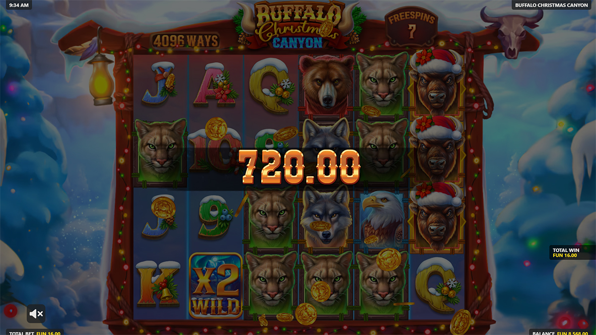 Buffalo Christmas Canyon does not use traditional paylines, instead offering 4,096 ways to win. Wins are formed by landing matching symbols on adjacent reels from left to right, requiring only two symbols to create a payout. This system increases flexibility and keeps gameplay dynamic across every spin.