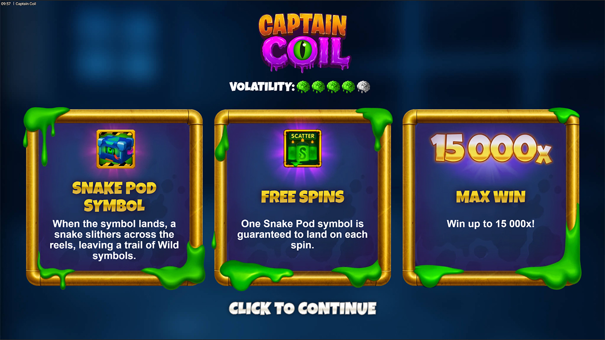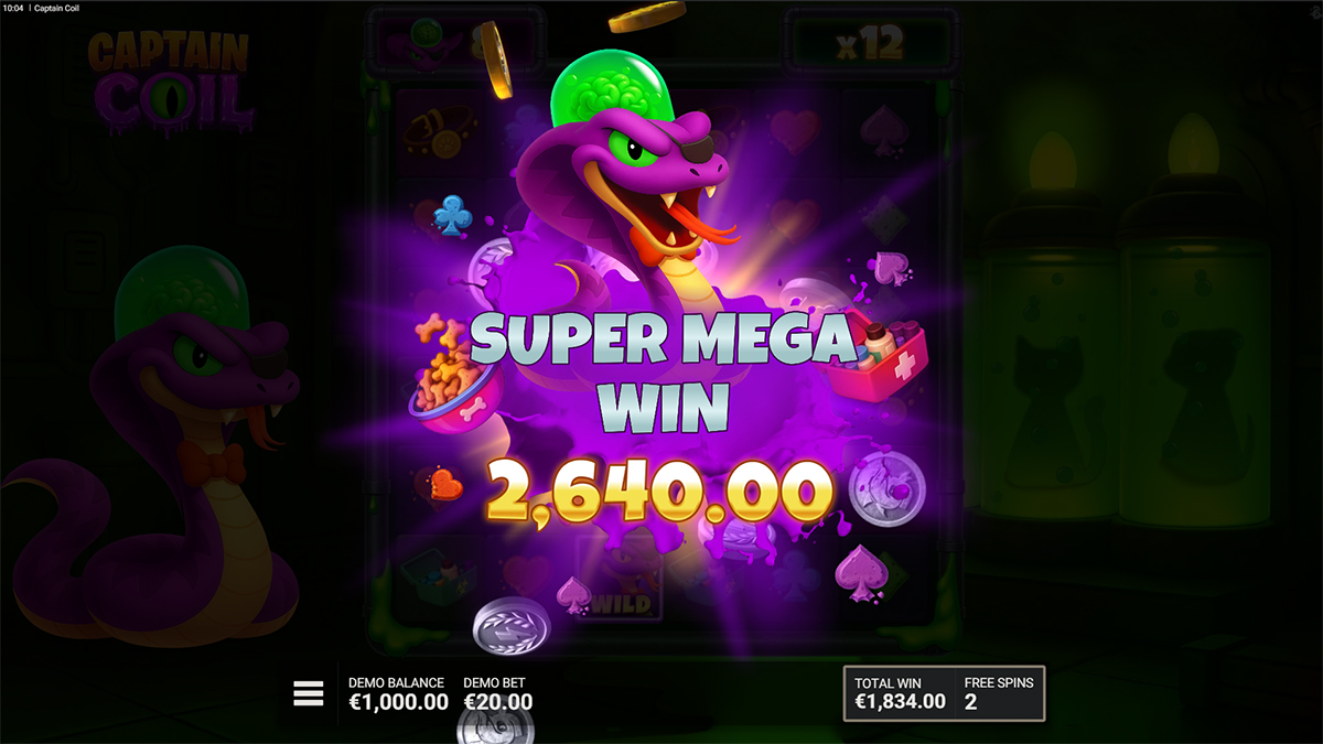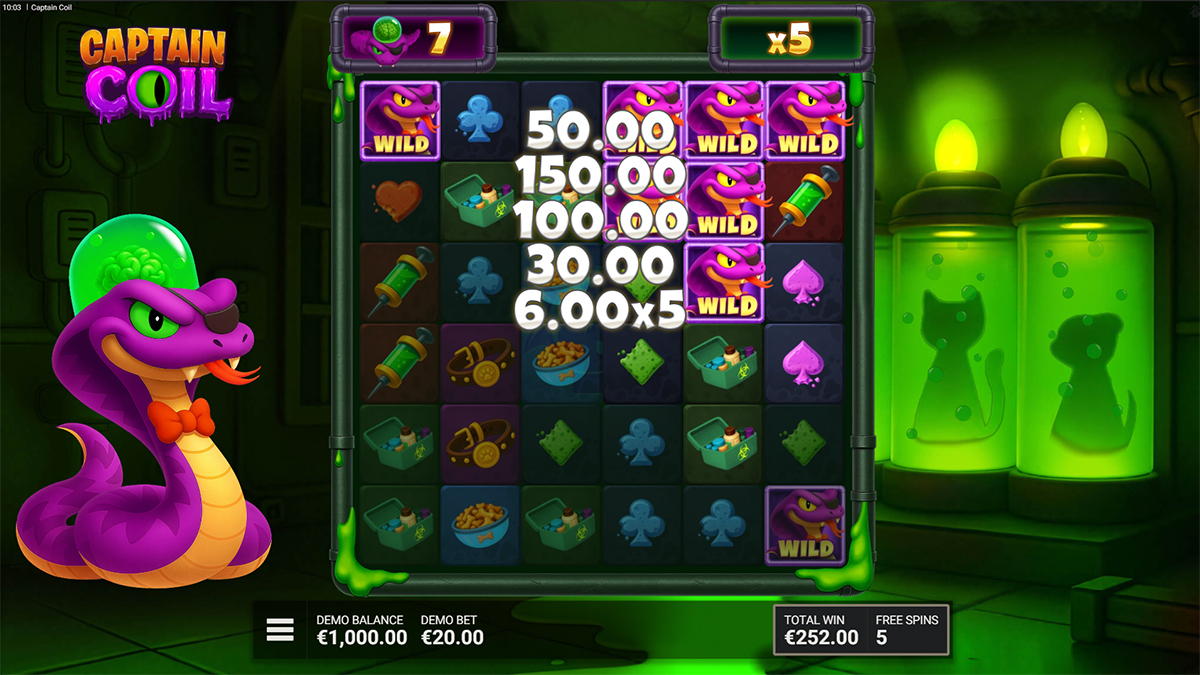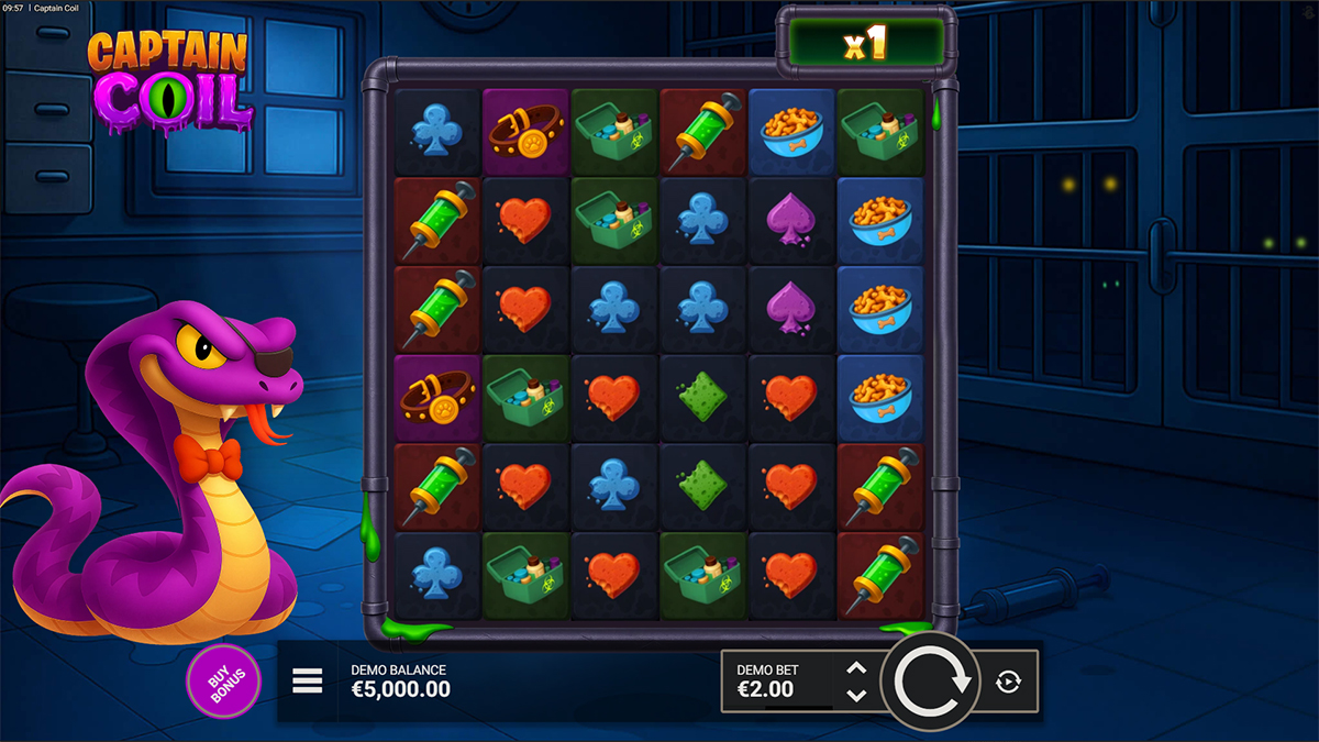 Captain Coil is an action-packed video slot that blends arcade nostalgia with modern casino mechanics, placing players in a quirky laboratory ruled by a stylish yet sinister snake scientist. Instead of focusing heavily on story progression, the game uses its theme as a visual and mechanical foundation for its most important feature: the Snake-inspired trail system that spreads Wilds and multipliers across the grid. With six reels, cluster pays, and cascading wins, the slot emphasizes momentum-based gameplay where one successful spin can quickly snowball into multiple payouts. The constant movement of symbols, combined with the growing Global Multiplier and the potential for massive streaks, creates an experience that feels fast, energetic, and rewarding. Designed to support both casual play and high-risk strategies, Captain Coil stands out by turning a simple concept into a feature-driven slot with strong replay value and high win potential.