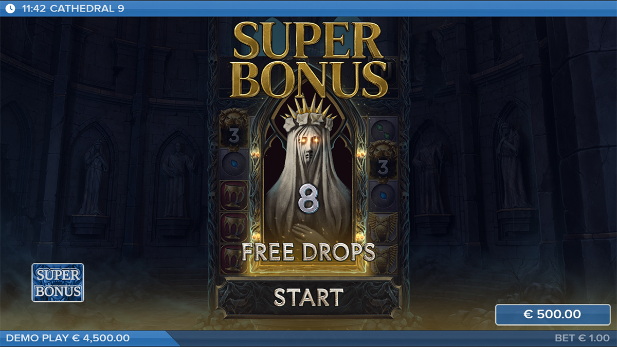 Yes, Cathedral 9 includes a Free Drops round, which functions similarly to traditional free spins. Players can trigger this bonus by landing 3 to 6 scatter symbols, awarding 2 to 4 free drops per scatter. The round features a persistent global multiplier and the potential to unlock a super bonus for even greater rewards.
