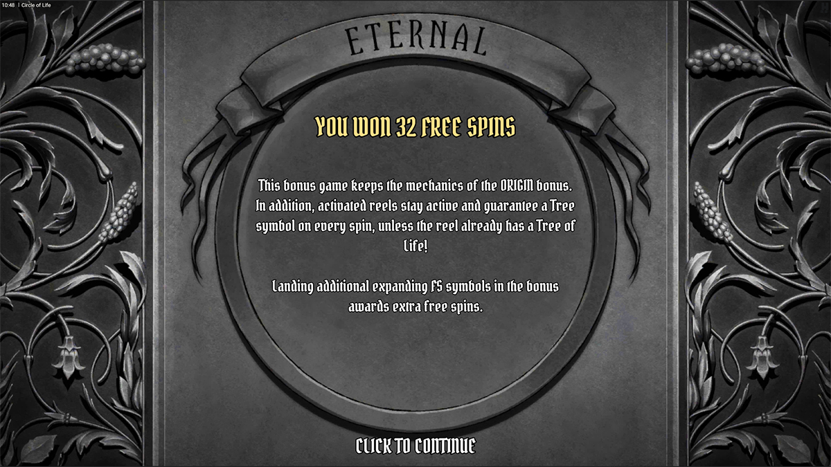 Circle of Life FreeSpinsThe free spins feature in Circle of Life is activated by landing three or more expanding FS Scatter symbols anywhere on the reels, with each Scatter expanding to cover its entire reel and contributing bonus spin values. The total number of awarded free spins is calculated by adding together the values displayed on the expanded positions, often resulting in substantial starting spin counts. Depending on the number of Scatters and Upgrade symbols collected, players may enter the Origin, Eternal, or Rebirth bonus modes, each offering increasingly powerful mechanics. During free spins, Tree of Life symbols gain enhanced importance through sticky behavior and guaranteed placements on activated reels. This structure transforms the bonus rounds into extended feature sequences where persistent multipliers and expanding Trees can generate massive payout chains.