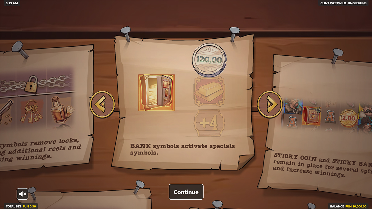 Yes, Clint Westwild: Jingleguns includes a Free Spins bonus round. This feature is triggered by collecting Scatter symbols, which must first be activated by the Bank collector symbol. Once unlocked, the Free Spins mode increases feature activity and payout potential.
