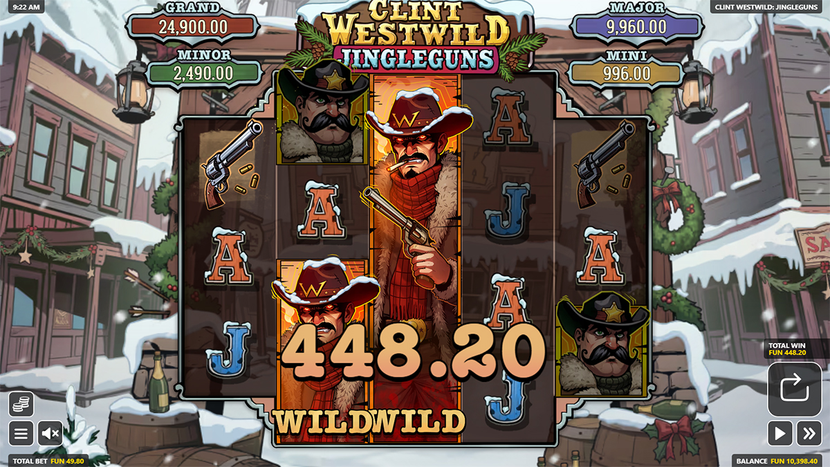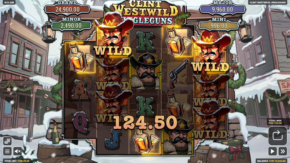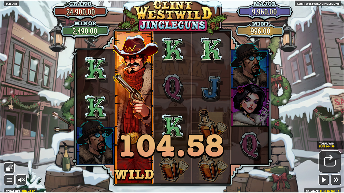 The minimum bet in Clint Westwild: Jingleguns starts at 0.30 in fun mode. The maximum bet varies depending on the casino platform and local betting configurations. This flexible range makes the slot accessible to both casual players and high-stakes bettors.