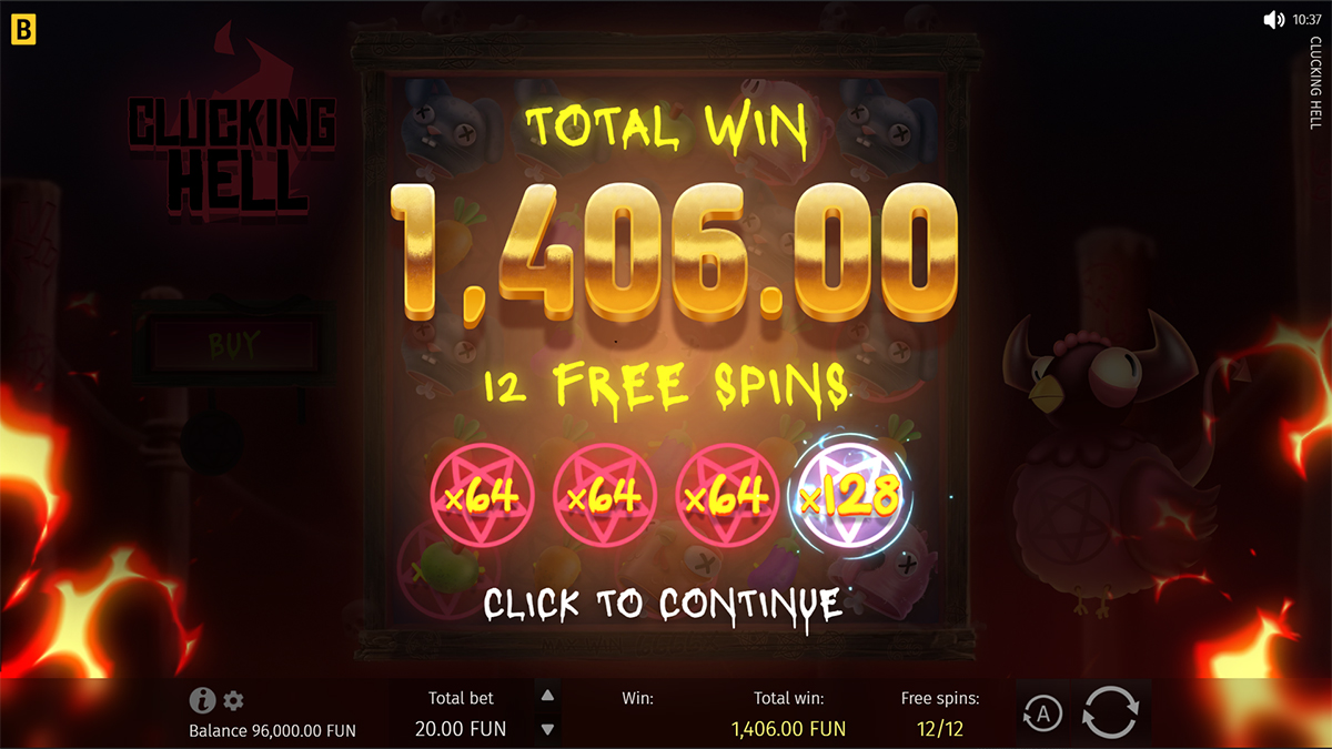 The betting range in Clucking Hell spans from a minimum of €0.20 per spin up to a maximum of €20. This range ensures that both casual players and those who prefer higher stakes can comfortably enjoy the game. With the top win of 6,666x available across all bet levels, the thrill is accessible to every type of player.