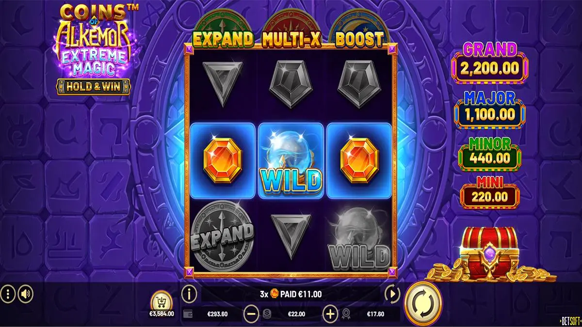 Coins of Alkemor: Extreme Magic – Hold & Win delivers an exceptionally focused and imaginative slot experience rooted in a compact 3×3 grid yet brimming with engaging features. Betsoft has once again proven that size isn’t everything by infusing this small-format slot with an impressive lineup of bonus mechanics and thematic cohesion that never lets up. From the moment the game loads, players are immersed in Alkemor’s magical world, supported by mystical visuals, enchanting sounds, and a dynamic pace that keeps you coming back for more. The Hold & Win feature is the central spectacle, elevated by the trio of “Extreme” modifiers—EXPAND, MULTI-X, and BOOST—which transform what would be a basic respin round into an adrenaline-pumping win accelerator. Additionally, the inclusion of the CHEST OF GOLD random trigger in the base game keeps things fresh, ensuring that even outside of bonuses, there’s something magical to anticipate. Coins of Alkemor successfully bridges the gap between classic slot simplicity and modern feature-packed complexity, making it suitable for both purists and feature hunters alike. While there’s no traditional free spins mode, the game makes up for this with an immersive bonus framework and a fair RTP of 96.14%. With very high volatility, players who enjoy the thrill of chasing larger payouts will find plenty to appreciate here. The result is a bold, stylish, and deeply rewarding slot that honors its magical theme while innovating where it counts the most.