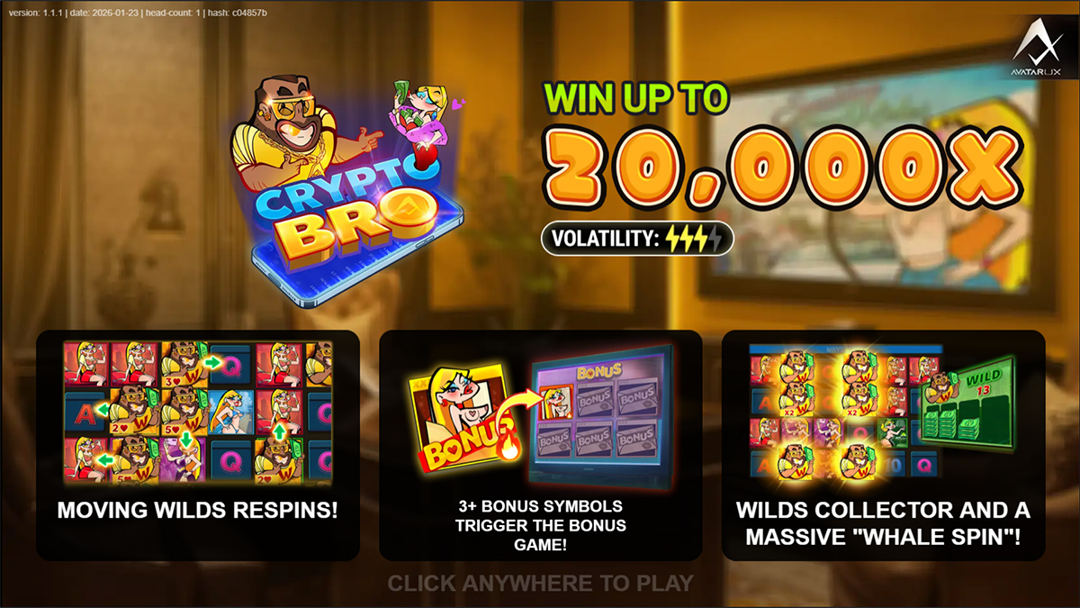 Crypto Bro is a flashy and high-energy slot experience from AvatarUX that places players directly inside a stylized crypto trader’s luxury lifestyle, blending humor, exaggerated visuals, and high-risk, high-reward gameplay into a single cohesive package. Set on a 6×4 grid with 4,096 ways to win, the game embraces modern internet culture and speculative trading themes, presenting an atmosphere that feels bold, playful, and intentionally over-the-top. With a maximum win potential of 20,000x the bet and features such as Moving Wild Respins, Whale Spins, and a multi-layered Free Spins round, Crypto Bro is designed to appeal to players who enjoy volatility-driven excitement and cinematic bonus sequences. The combination of striking character design, energetic animations, and interactive mechanics makes this slot feel more like a dynamic mini-adventure than a traditional reel spinner, creating strong engagement from the first spin.