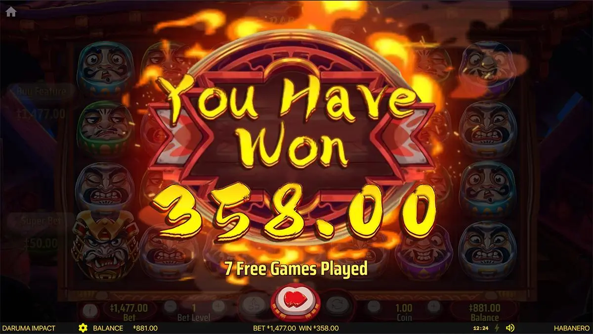 Yes, Daruma Impact includes an engaging Free Spins round that can be triggered by landing three or more Scatter symbols in a single spin. Depending on how many Scatters land, players can unlock up to 57 Free Games in one go. The round is enriched with Mega Symbols and expanded win potential, making it a major highlight of the gameplay.