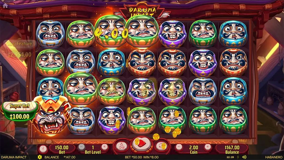 Daruma Impact features 50 fixed paylines across its 7×4 reel structure, giving players numerous ways to form winning combinations. The expanded reel layout allows for dynamic symbol alignment, particularly when Mega Symbols and stacked icons come into play. This configuration enhances the game’s balance between frequent wins and high-value payouts.