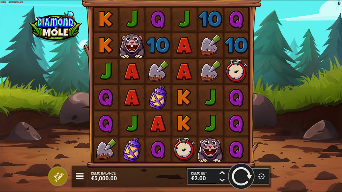 The most important symbol to watch is the Diamond Wild, which carries a growing multiplier and stays sticky on the reels. The mole symbol is the highest-paying standard icon and can deliver strong cluster payouts. Scatter symbols are also crucial, as they activate the Free Spins bonus round when three or more land.