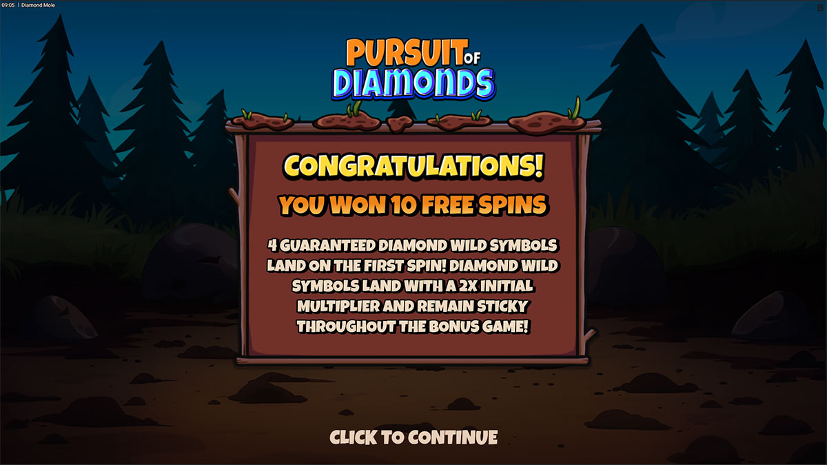 Diamond Mole BonusThe Free Spins feature is activated by landing three or more Scatter symbols during the base game. Three Scatters trigger The Diamond Trail, awarding 10 free spins with three guaranteed Diamond Wilds placed on the grid during the first spin, all of which remain sticky throughout the feature. Landing four Scatters instead triggers Pursuit of Diamonds, also granting 10 free spins but starting with four guaranteed Diamond Wilds, each with an initial 2x multiplier value. During these bonus rounds, the same cascade and cluster mechanics apply, but the persistent wild multipliers dramatically increase the chance of achieving exponential payouts as their values stack and combine across consecutive cascades.