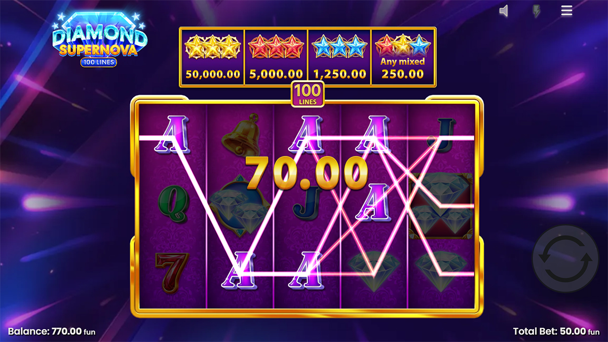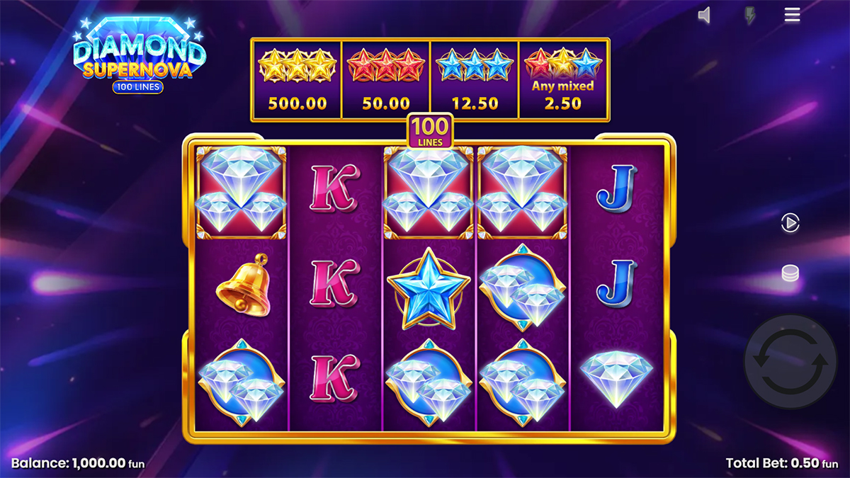 Diamond Supernova 100 keeps its feature set intentionally simple, focusing on frequent payouts rather than complex bonus mechanics. The game relies on symbol-based rewards rather than interactive bonus rounds.