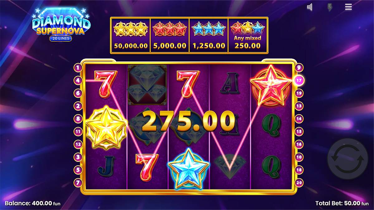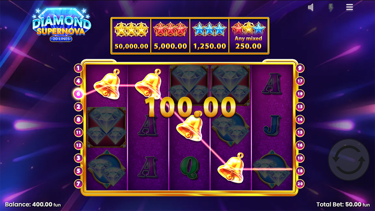 Diamond Supernova 20 features a total of 20 fixed paylines. All paylines are active at all times, so players do not need to adjust line settings. This structure keeps gameplay simple and ensures consistent win evaluation on every spin.