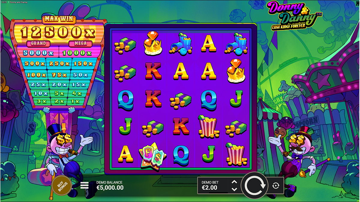 The high-paying symbols in Donny and Danny are designed to reflect the game’s carnival wealth theme, featuring visually rich icons such as stacks of cash, ornate cups, popcorn containers, and diamond-filled crowns. These symbols offer the strongest base-game payouts, delivering between 3x and 10x the bet for a full five-of-a-kind combination. Their bold designs make them easy to spot on the reels, helping players quickly recognize strong winning opportunities. While they do not drive the game’s largest payouts on their own, they provide meaningful rewards that help sustain momentum between feature triggers. These symbols also contribute to the overall visual spectacle, reinforcing the game’s focus on abundance and exaggerated wealth.